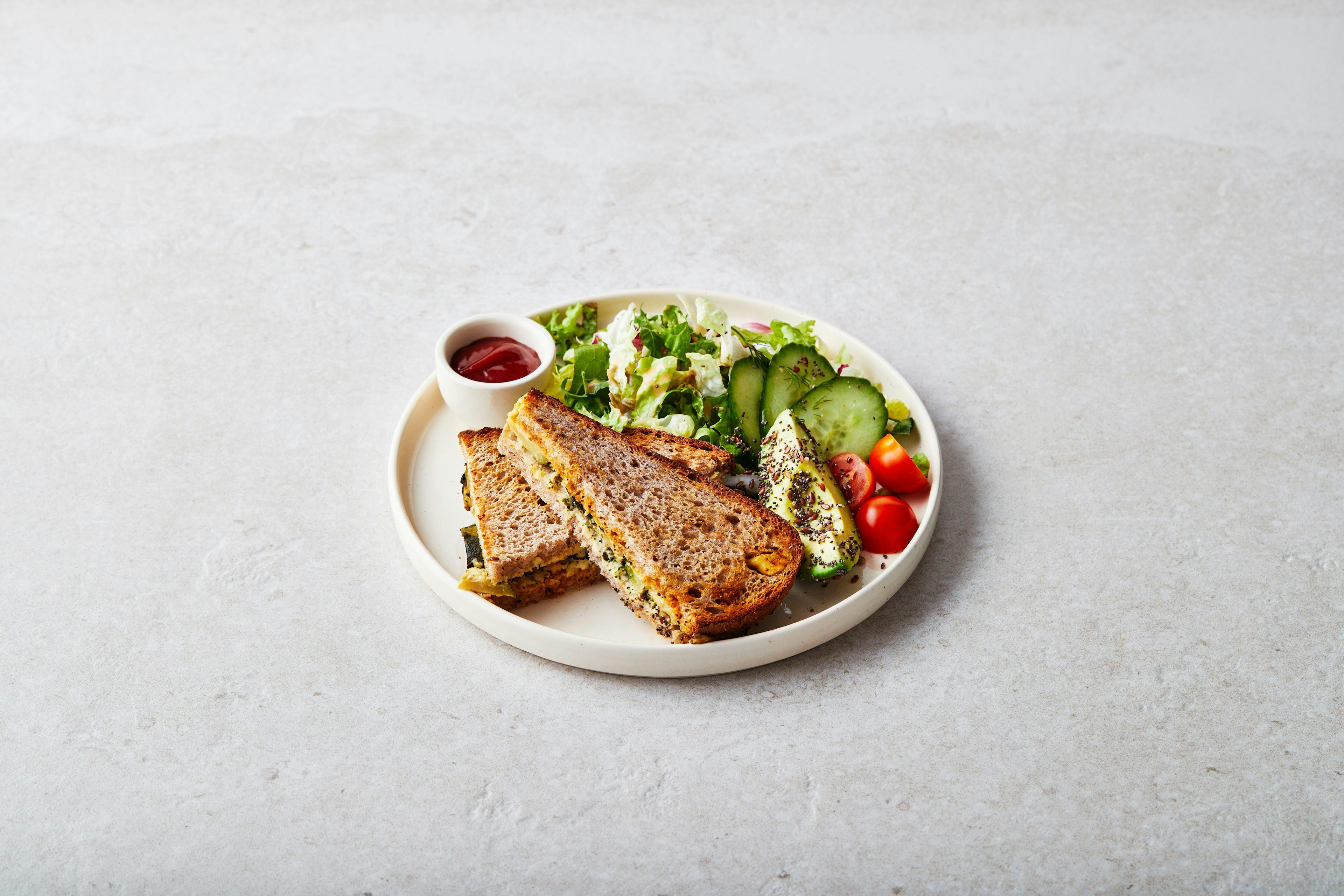 Een stevige veganistische draai aan een klassieke favoriet, met hummus en seizoensgroenten op ons kenmerkende biologische zuurdesembrood.