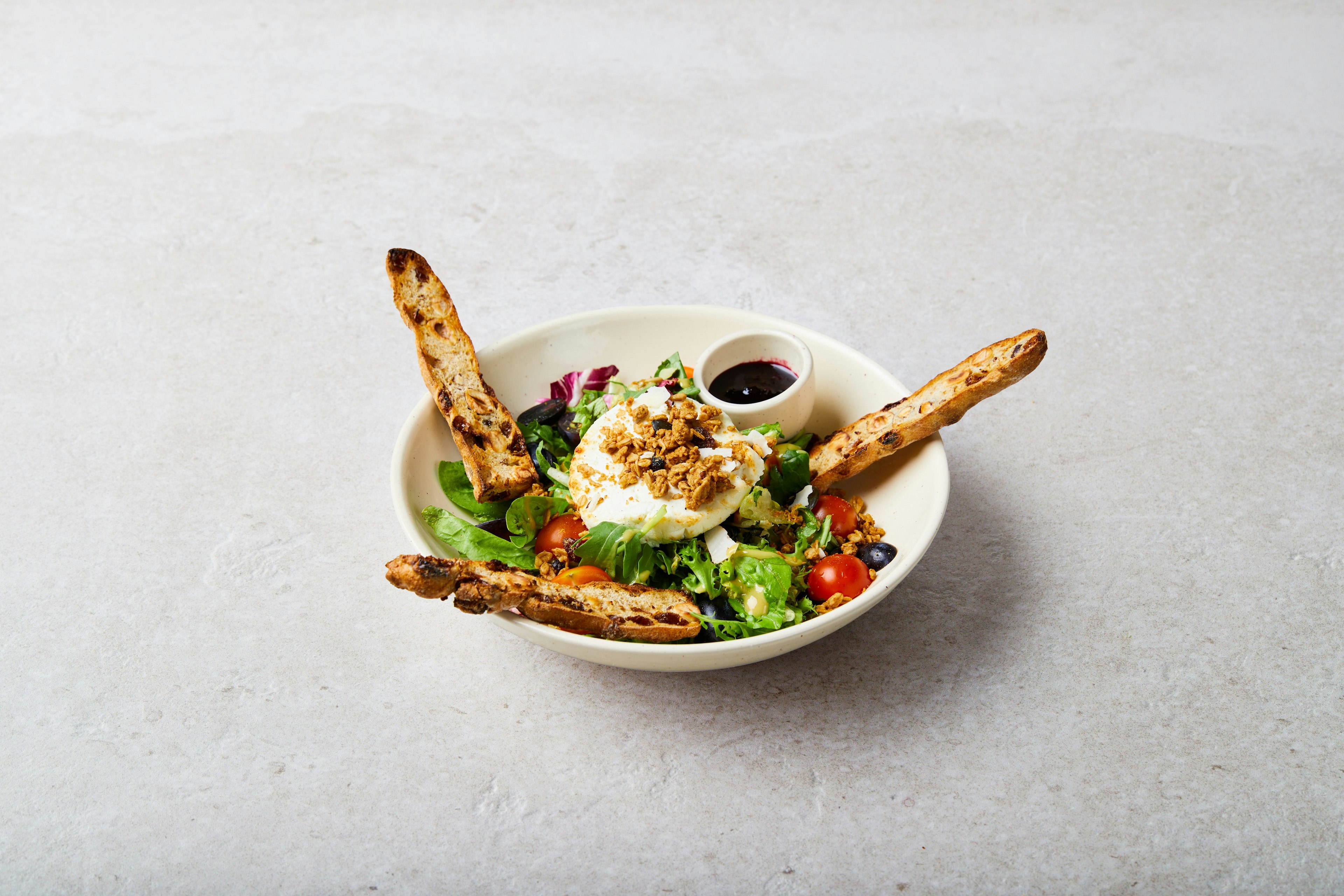 Geniet van onze levendige salade, waarin sappige heirloomtomaten schitteren naast romige burrata di bufala. Verse kiemgroenten en knapperig meergranen stokbrood maken deze heerlijke mix van texturen en smaken compleet.