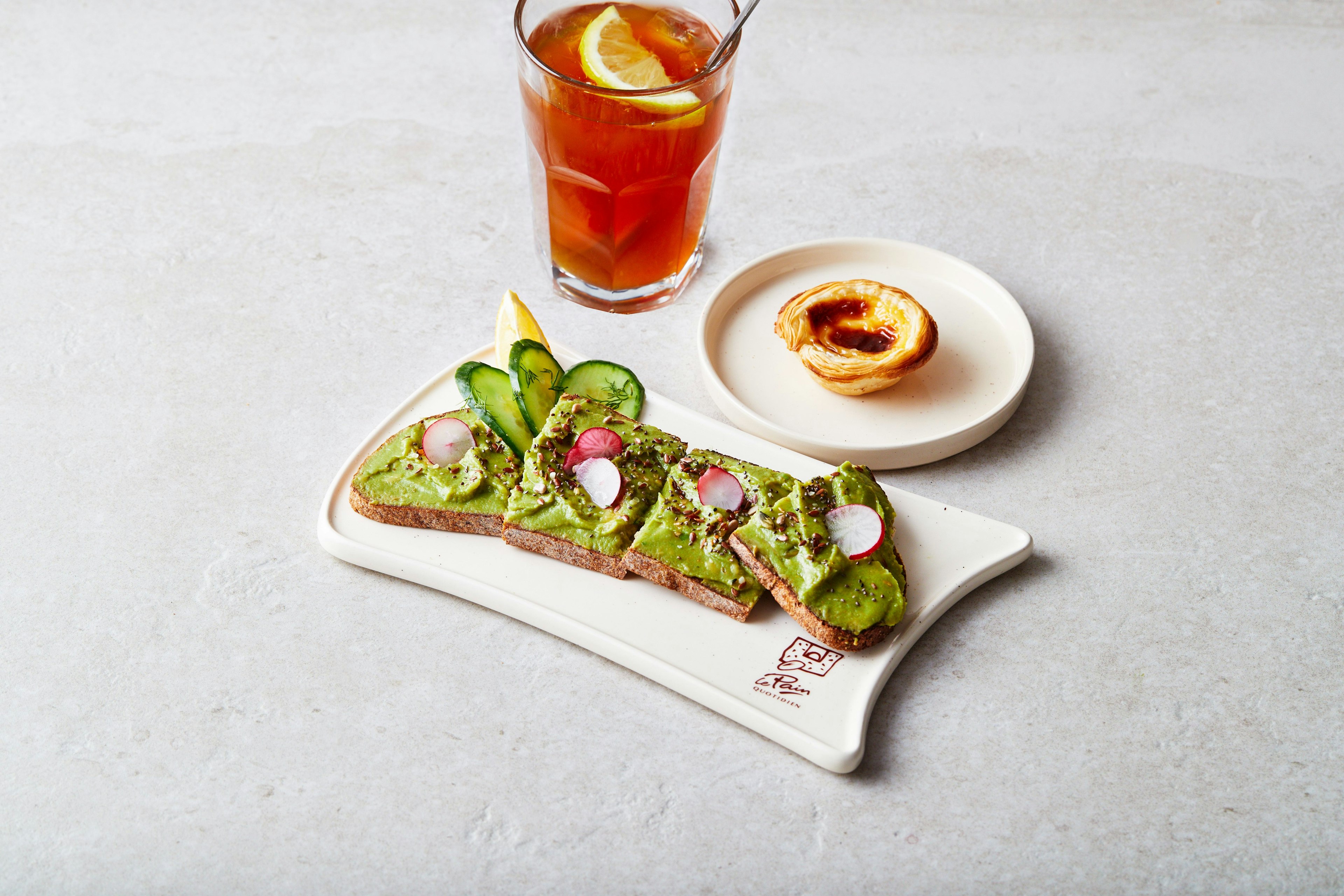 Kies tussen een tartine met Belgische boerenham en gouda, een tartine met tonijn of een avocado toast voor een smakelijke, evenwichtige lunch. Begeleid je maaltijd met een verfrissende huisgemaakte limonade, of plat of bruisend water.