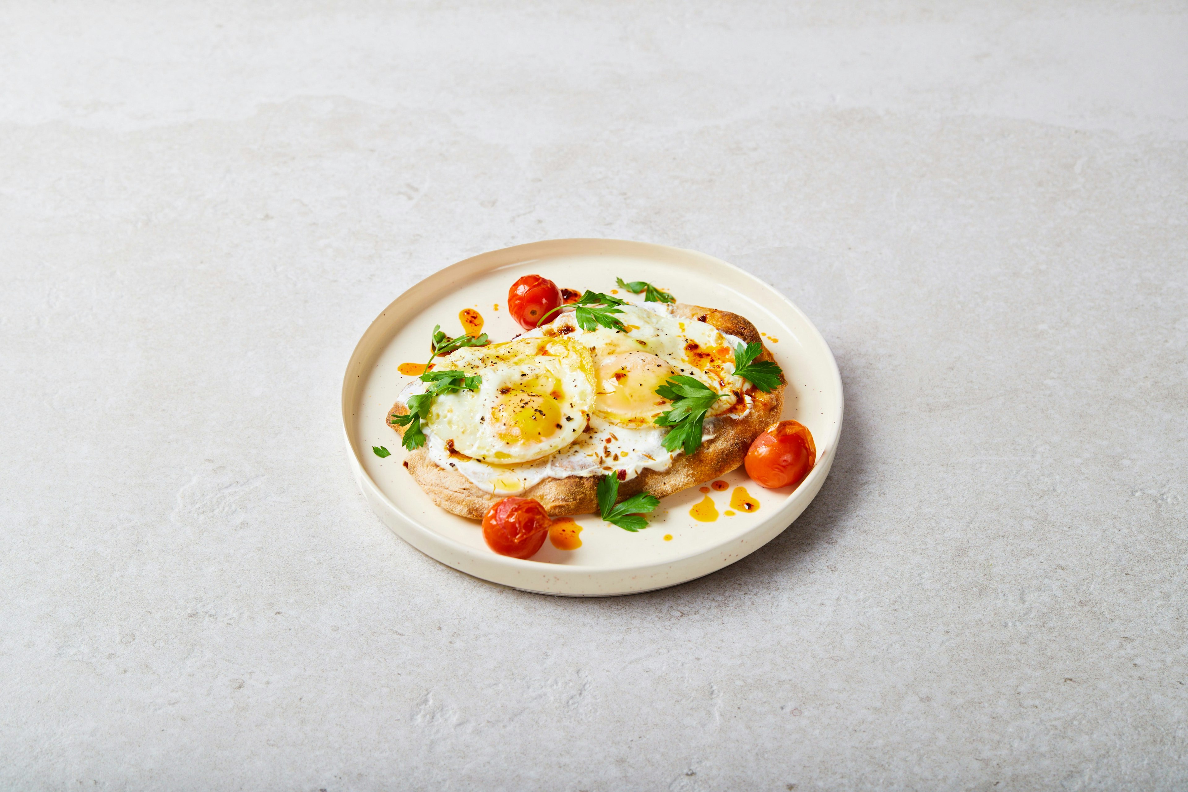 Een heerlijk zuurdesem flatbread, belegd met twee biologische gebakken eieren, biologische skyr met citroen en komijn, geroosterde kerstomaatjes, verse peterselie en zelfgemaakte gekruide olie. Een mix vol karakter!