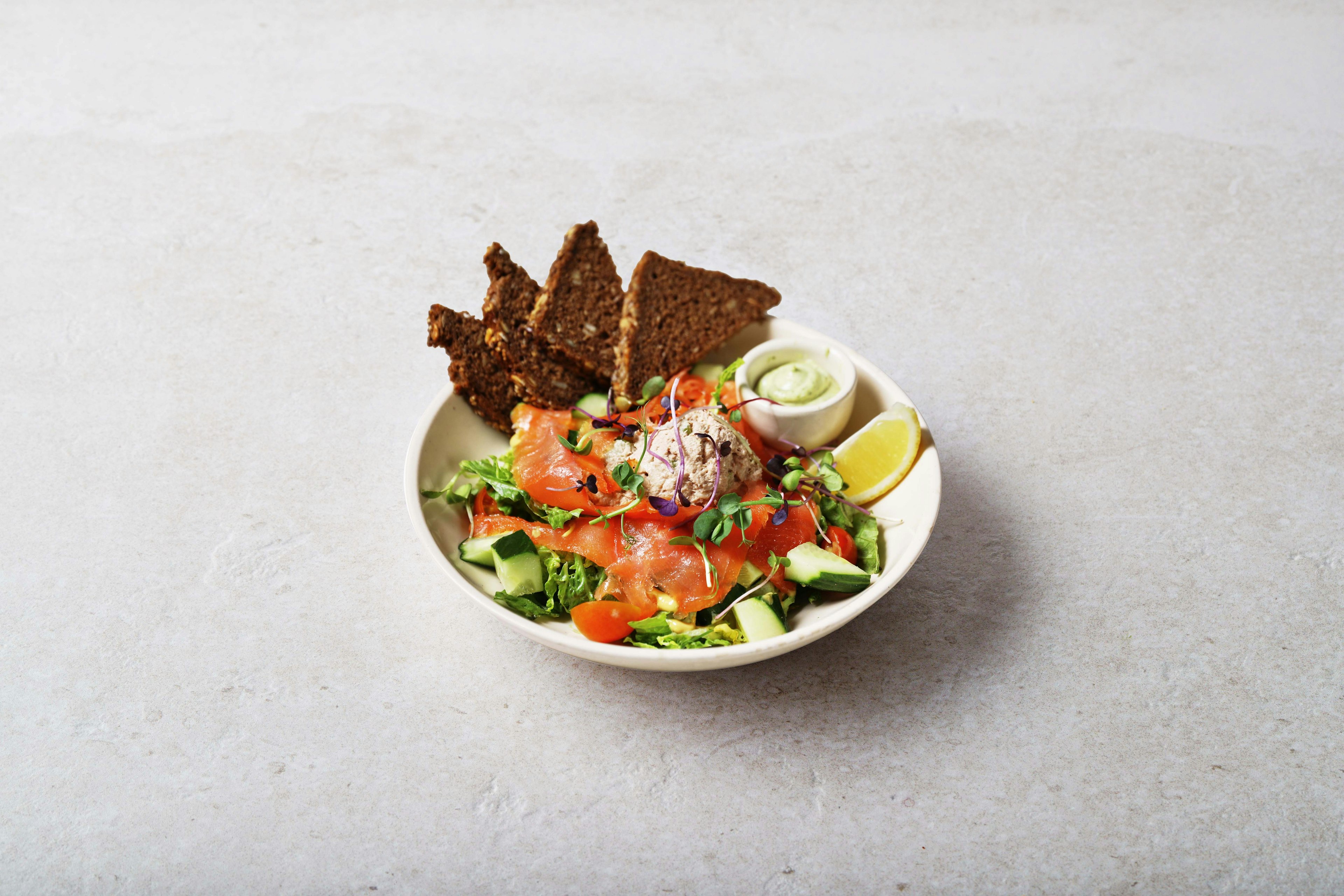 Ervaar de overvloed van de oceaan in onze salade met gerookte zalm en tonijn, waar de versheid van de zee samenkomt met de knapperigheid van het land. Delicaat Scandinavisch brood zorgt voor een stevige basis, aangevuld met een levendige mix van groenten.