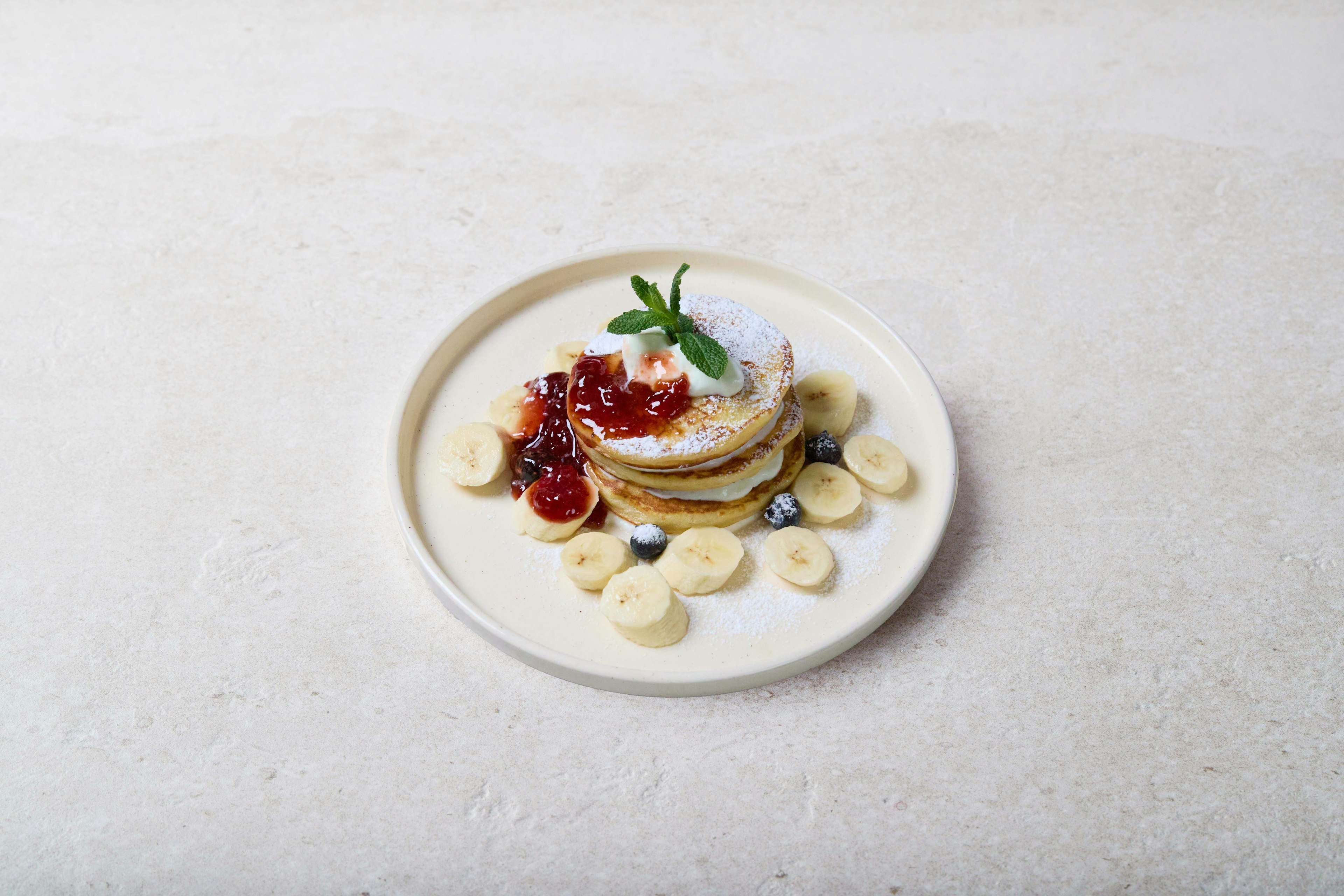 Verwen jezelf met onze verrukkelijke pannenkoeken, gemaakt om zowel licht als bevredigend te zijn. Ze worden perfect aangevuld met een mengeling van zoete en verfrissende toppings, waaronder een vleugje sappig fruit, een vleugje frisheid, een toefje romige lekkernijen en een zoete, fruitige spread.