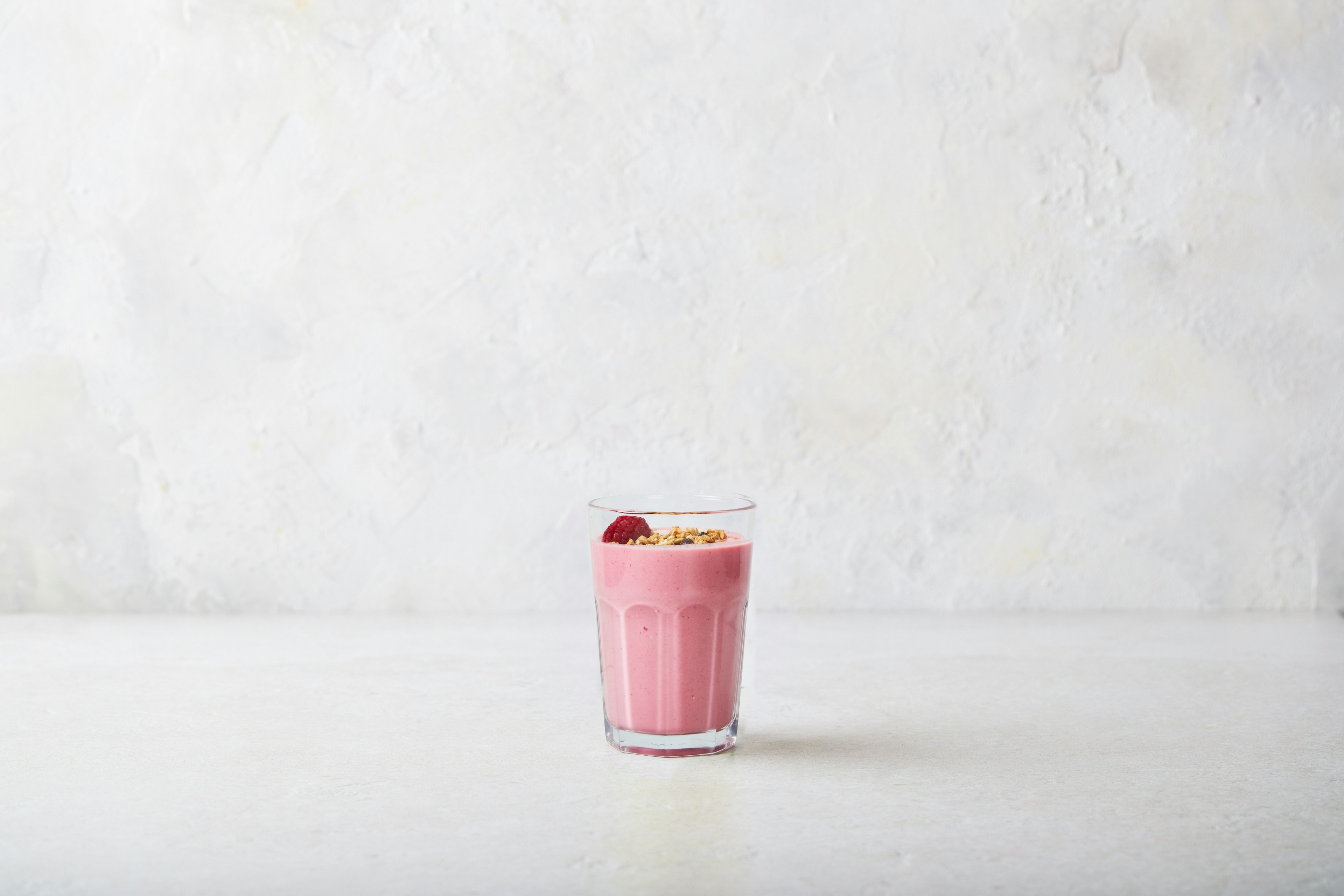Een frisse smoothie gemaakt met biologische skyr en verse frambozen, subtiel overgoten met granola voor een extra crunch.