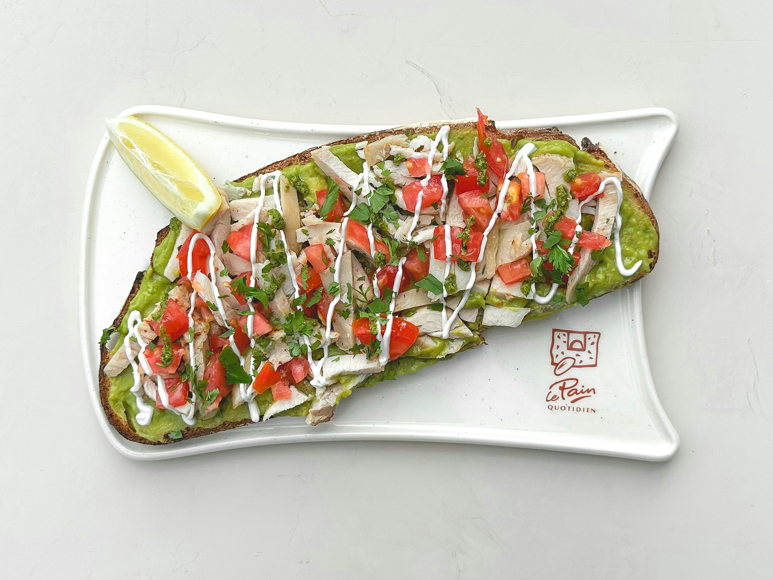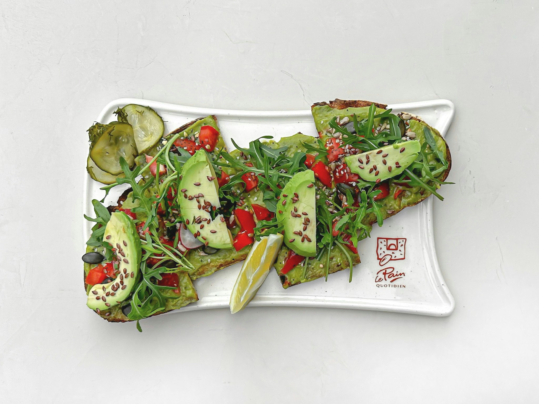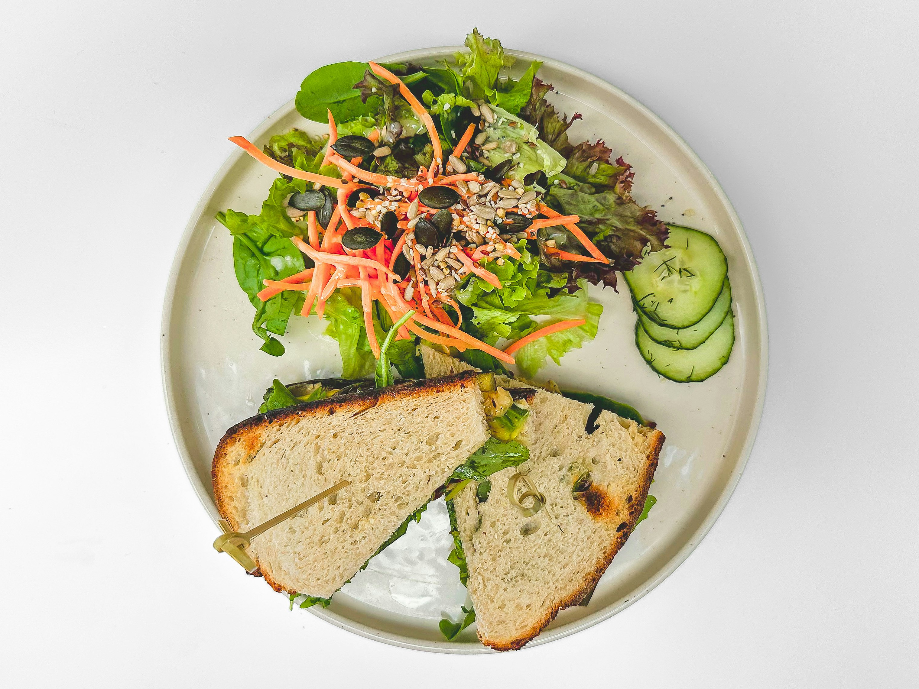 Toasted wheat bread, guacamole, tomato, radish, cucumber pickles, super seeds, rocket, and avocado