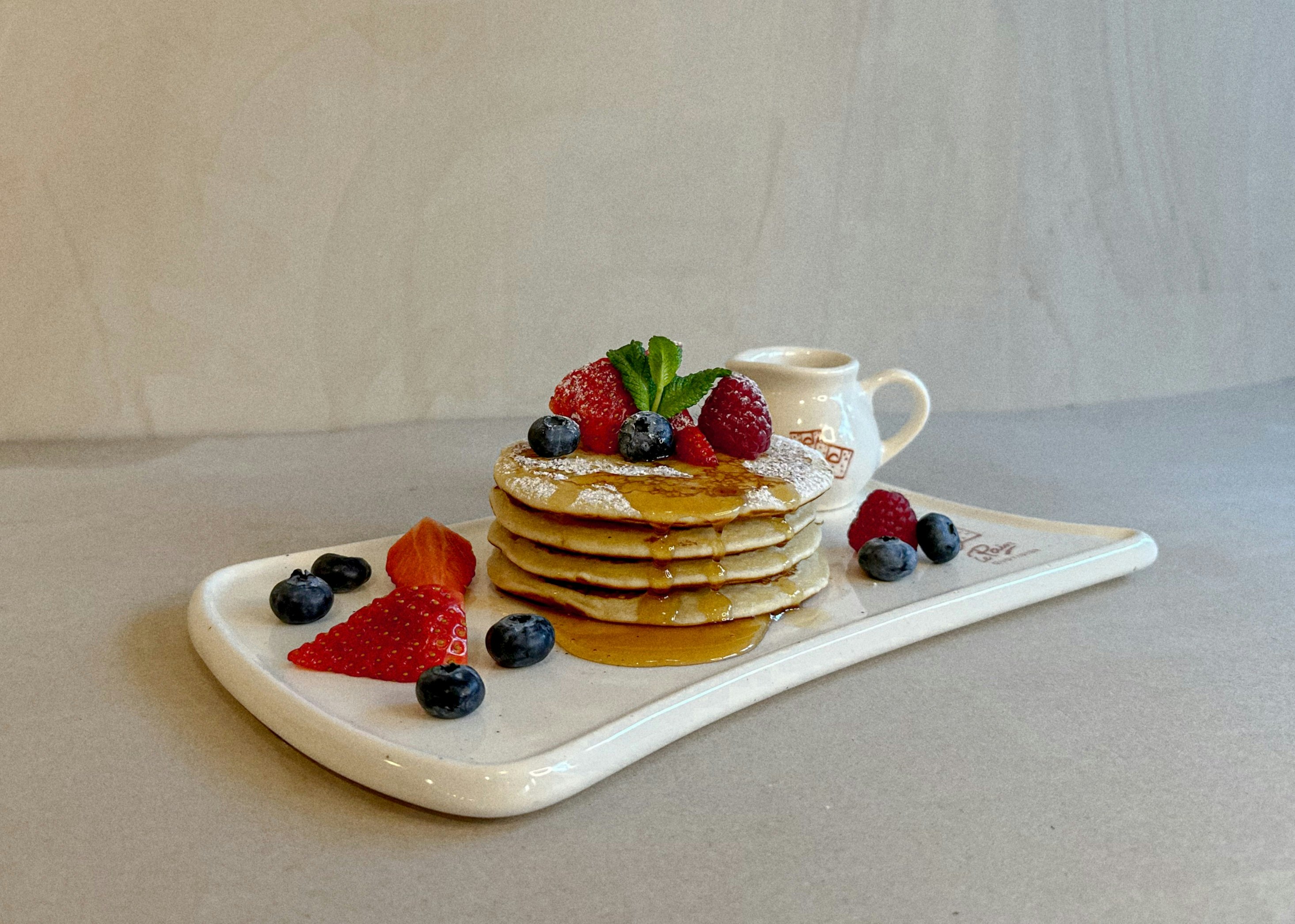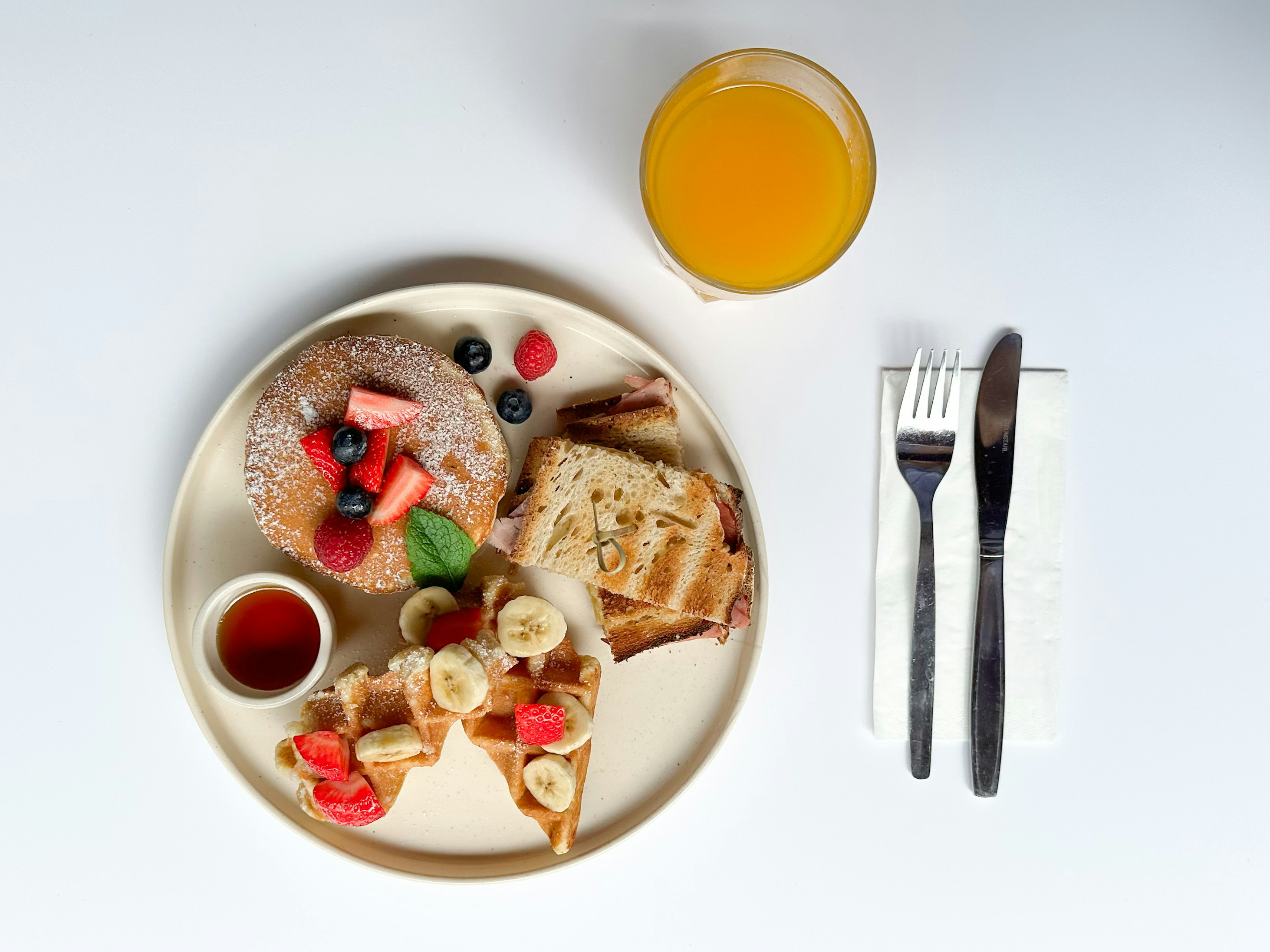 grilled ham & cheese, pancakes, Belgian waffle, banana, red fruit, maple syrup, homemade chocolate sauce, and fresh orange juice