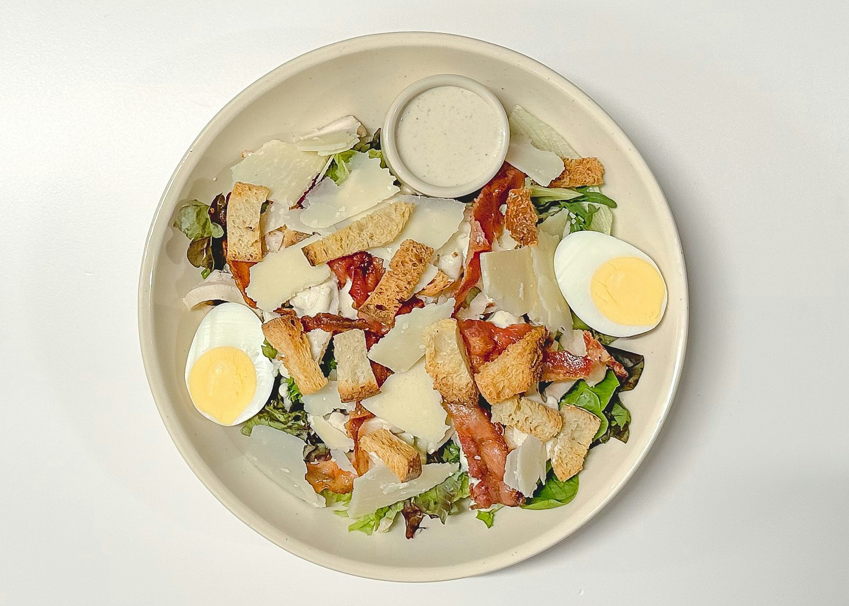 roast chicken, bacon, hard-boiled egg, Parmigiano Reggiano AOP, croutons, and authentic Caesar sauce