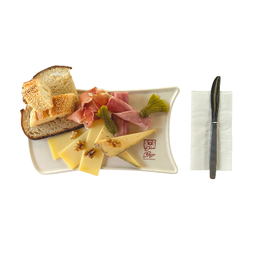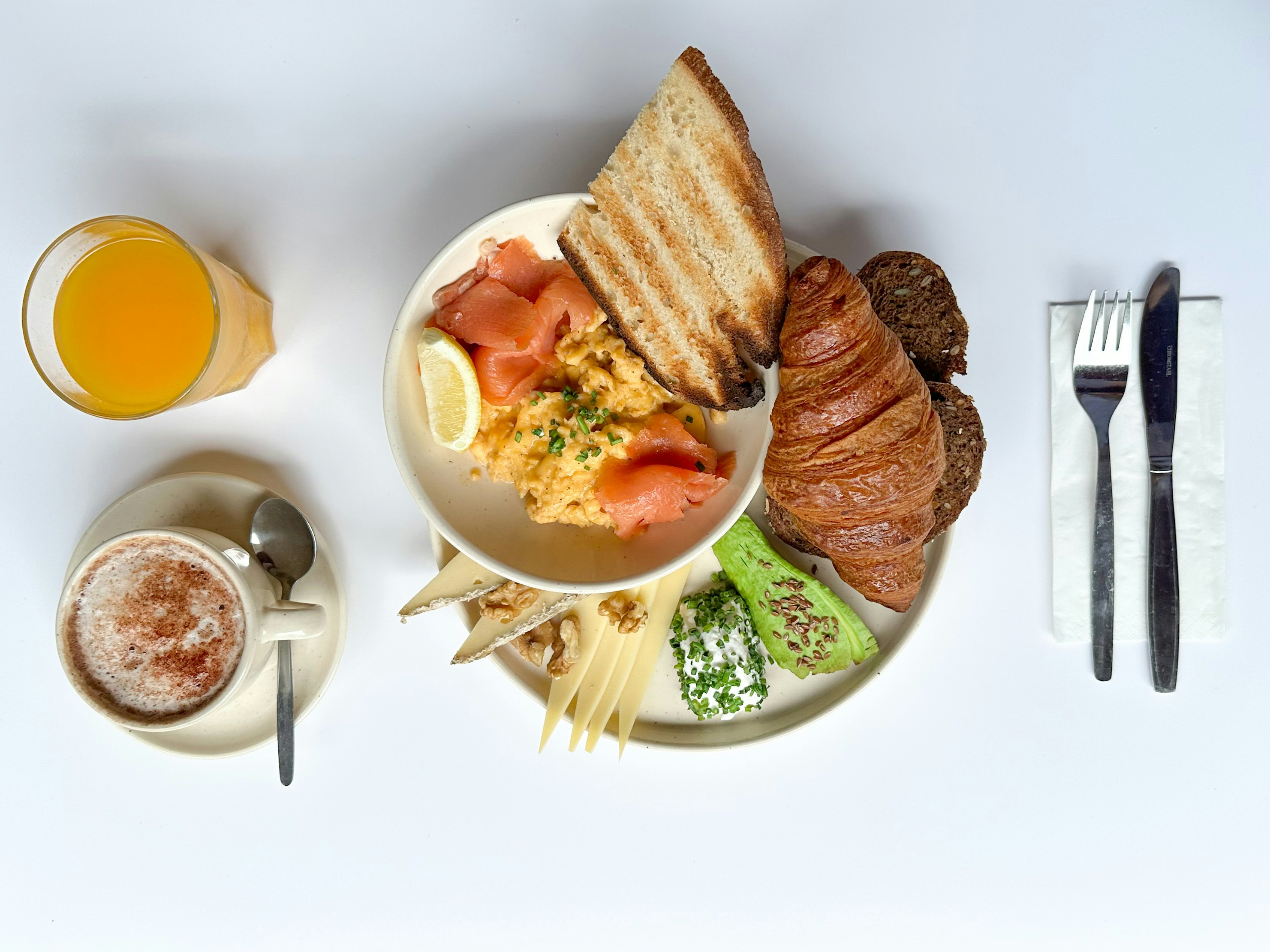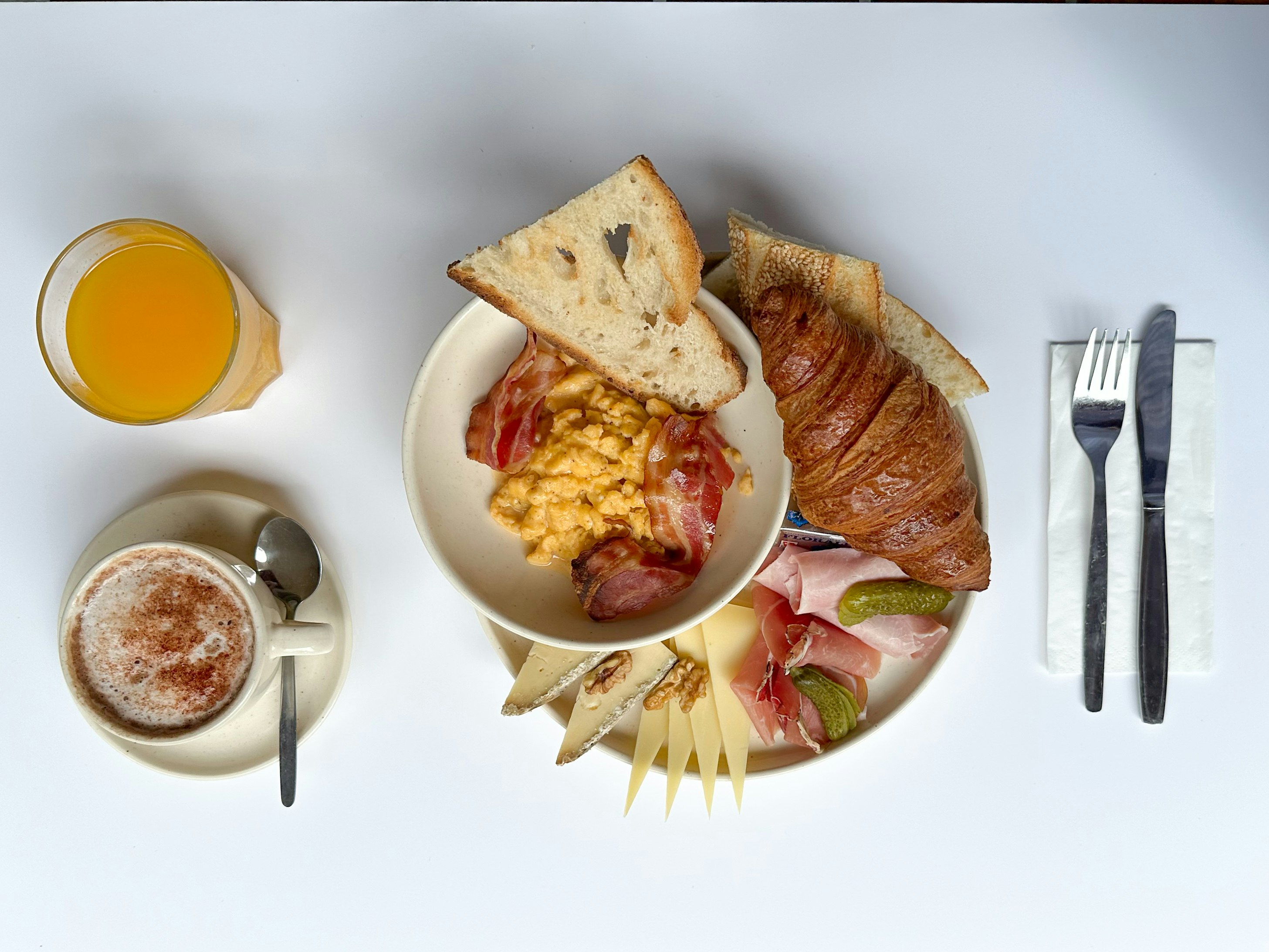 soft-boiled eggs, bacon, cured and cooked hams, Gruyère, Tomme cheese, baguette, organic GRTA wheat bread, croissant, choice of hot drink, and fresh orange juice 2dl