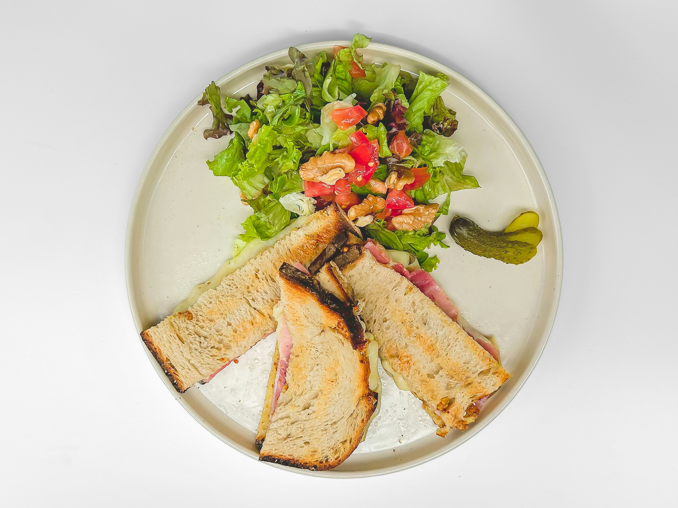 cooked ham, Gruyère AOC, wholegrain mustard, served with mixed leaves salad, tomato, and walnut