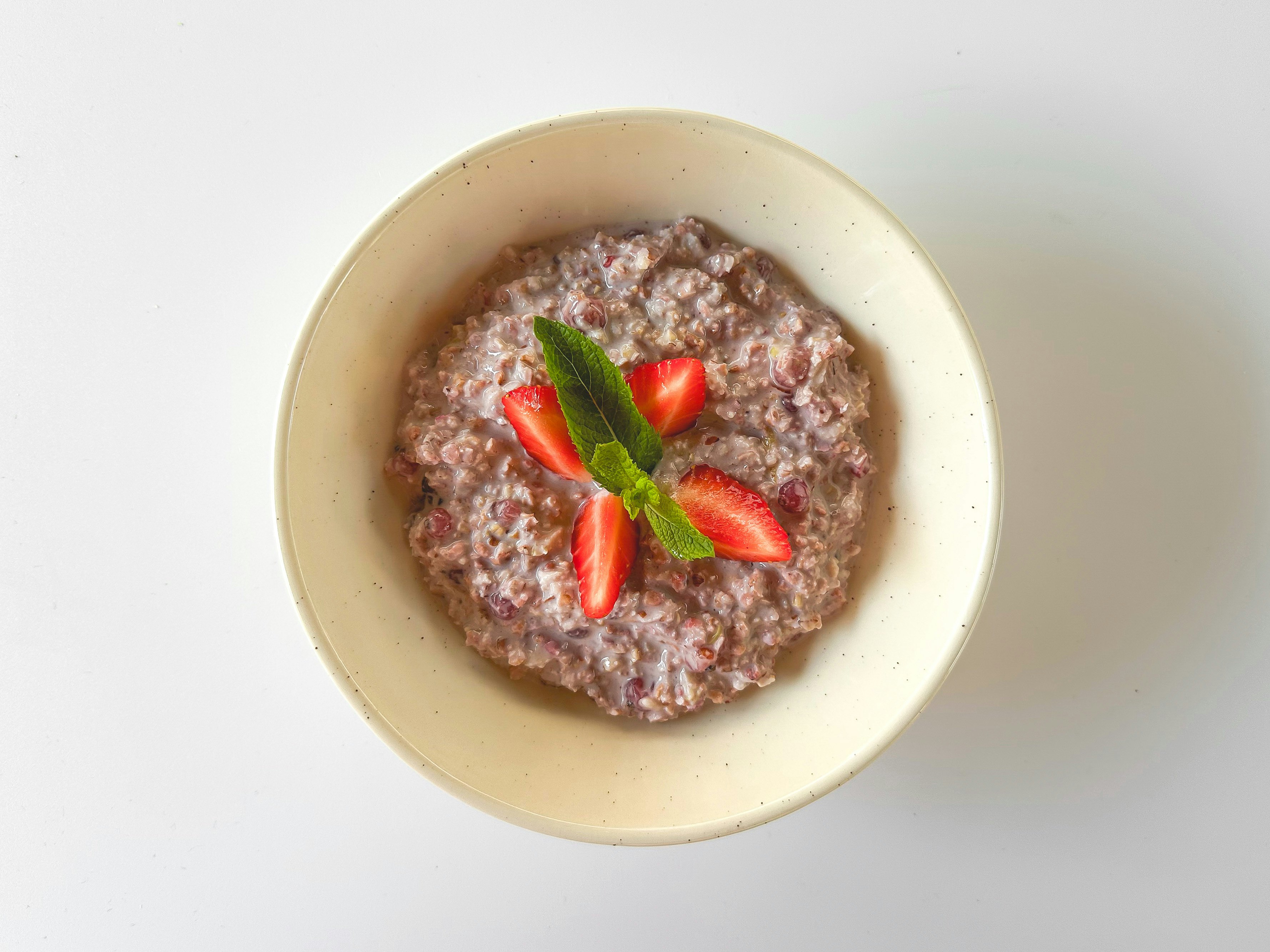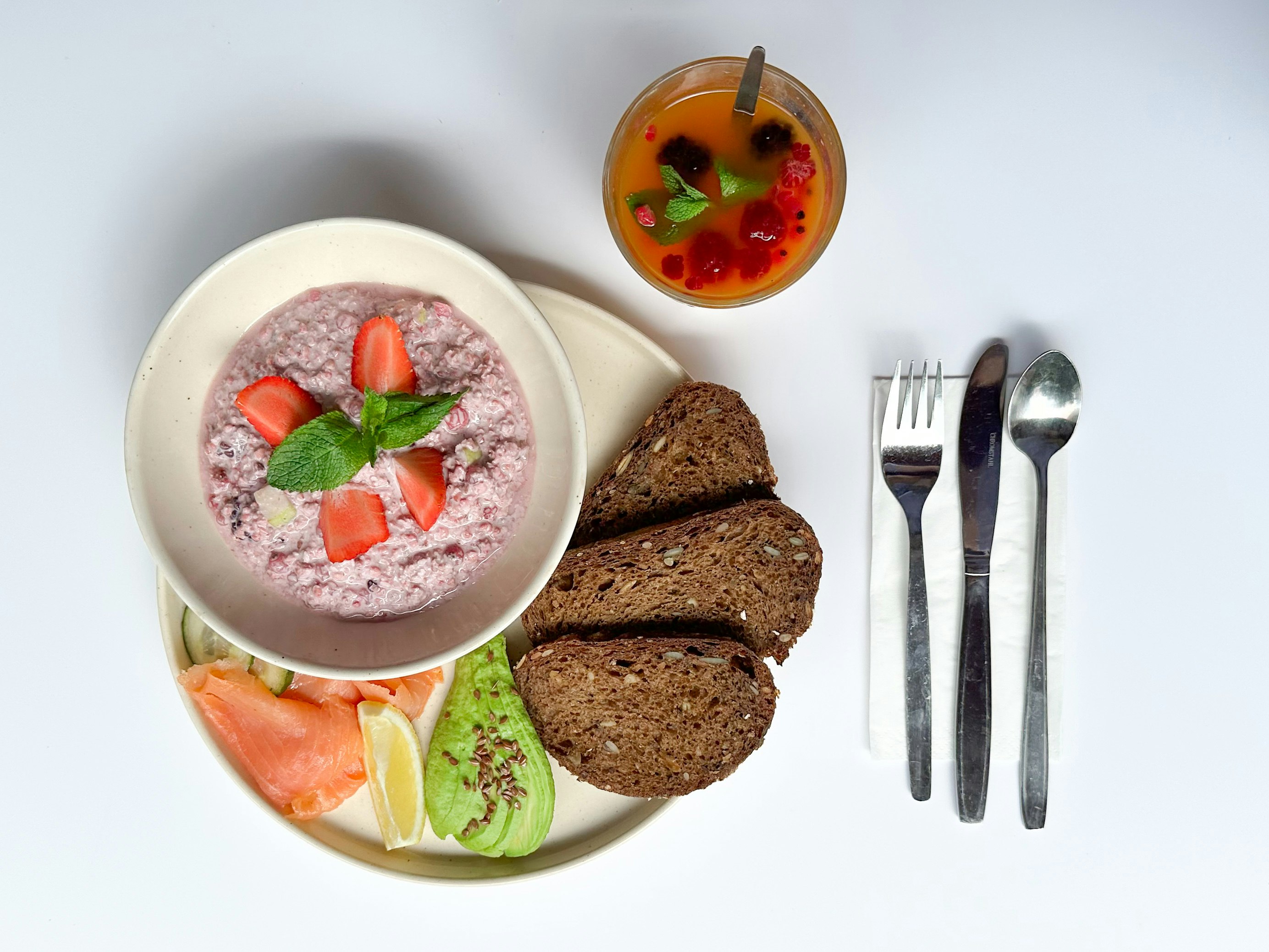 Nordic bread, smoked salmon, avocado, homemade organic bircher müesli or organic granola parfait and Berry Mint Booster