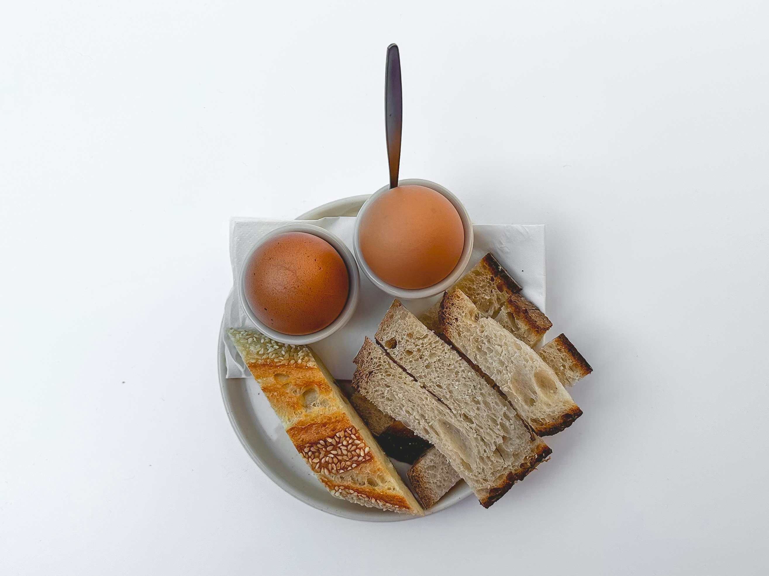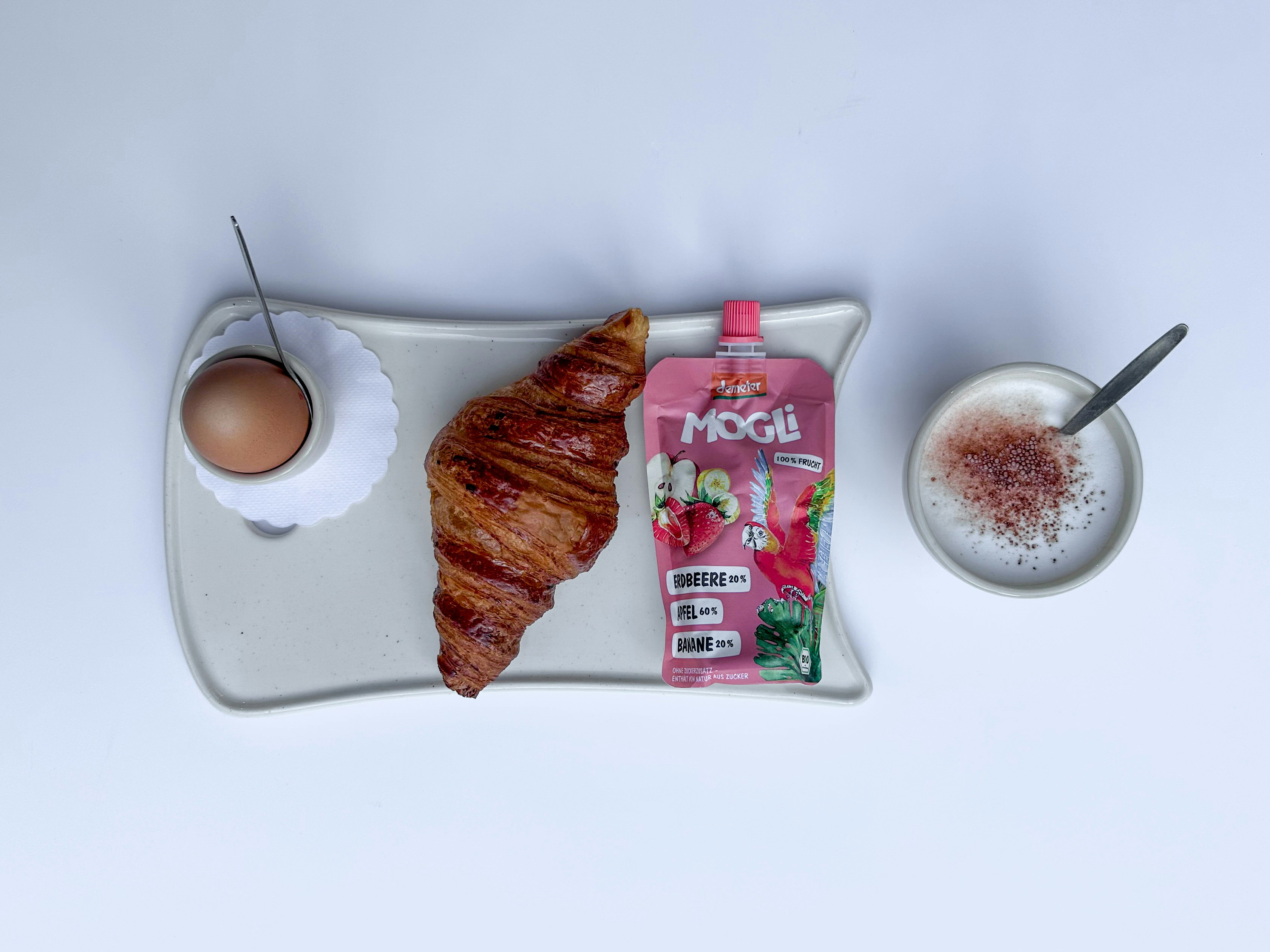soft-boiled egg, pain au chocolat, smoothie of your choice, and a mini homemade hot chocolate or babyccino