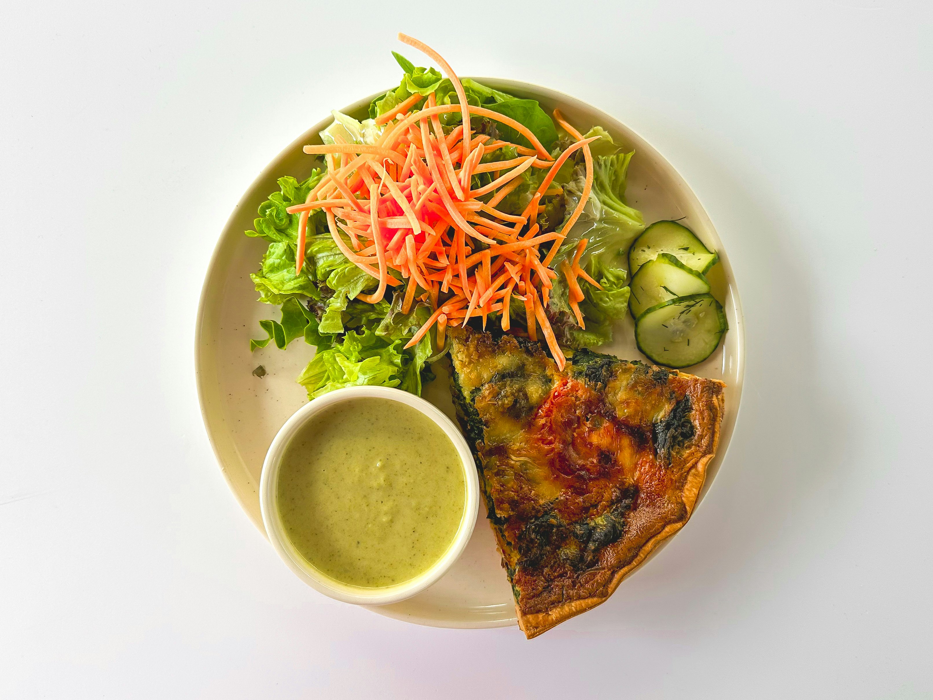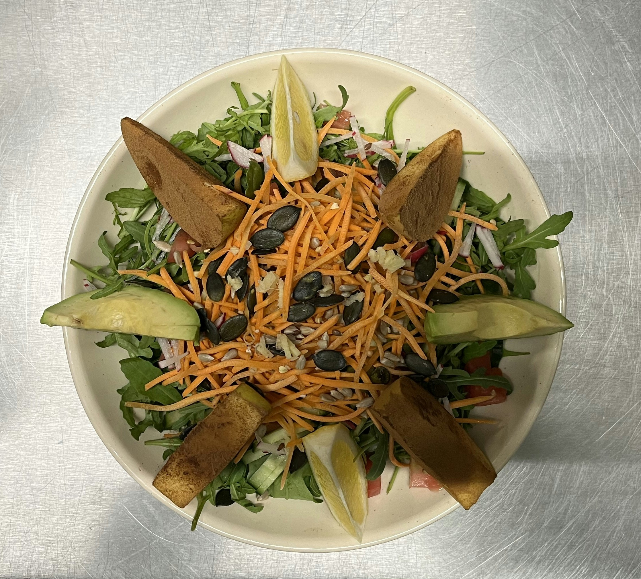 Hummus, avocado, grilled zucchini, tomato, cucumber pickles, basil pesto, served with mixed leaves salad, carrot, and super seeds