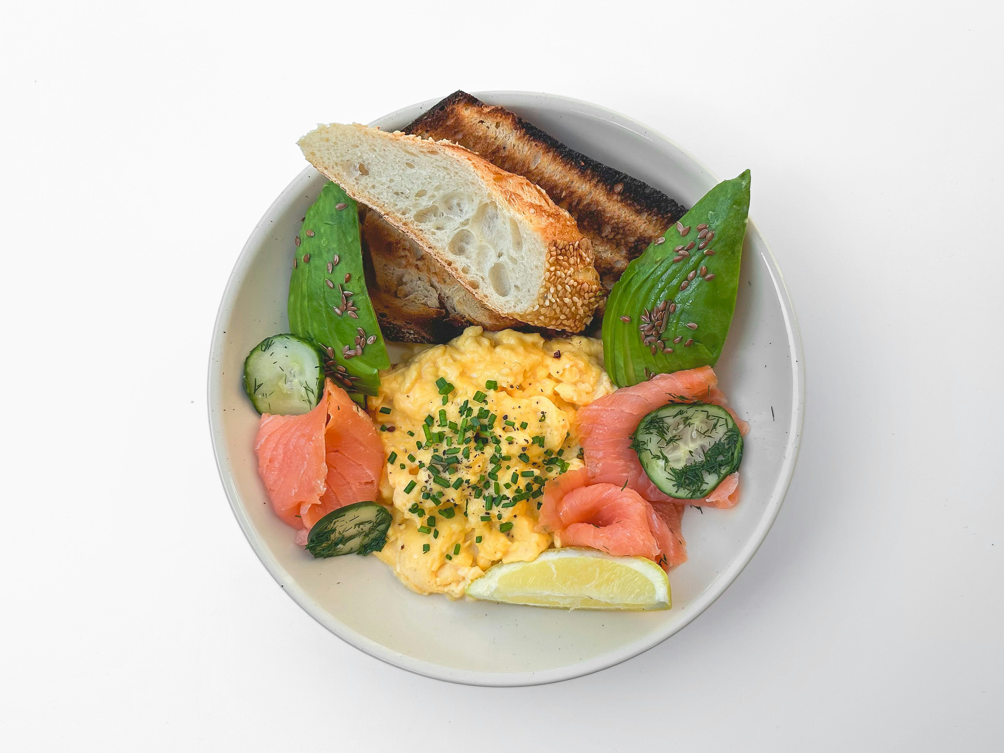 served with organic GRTA wheat bread, smoked salmon & avocado