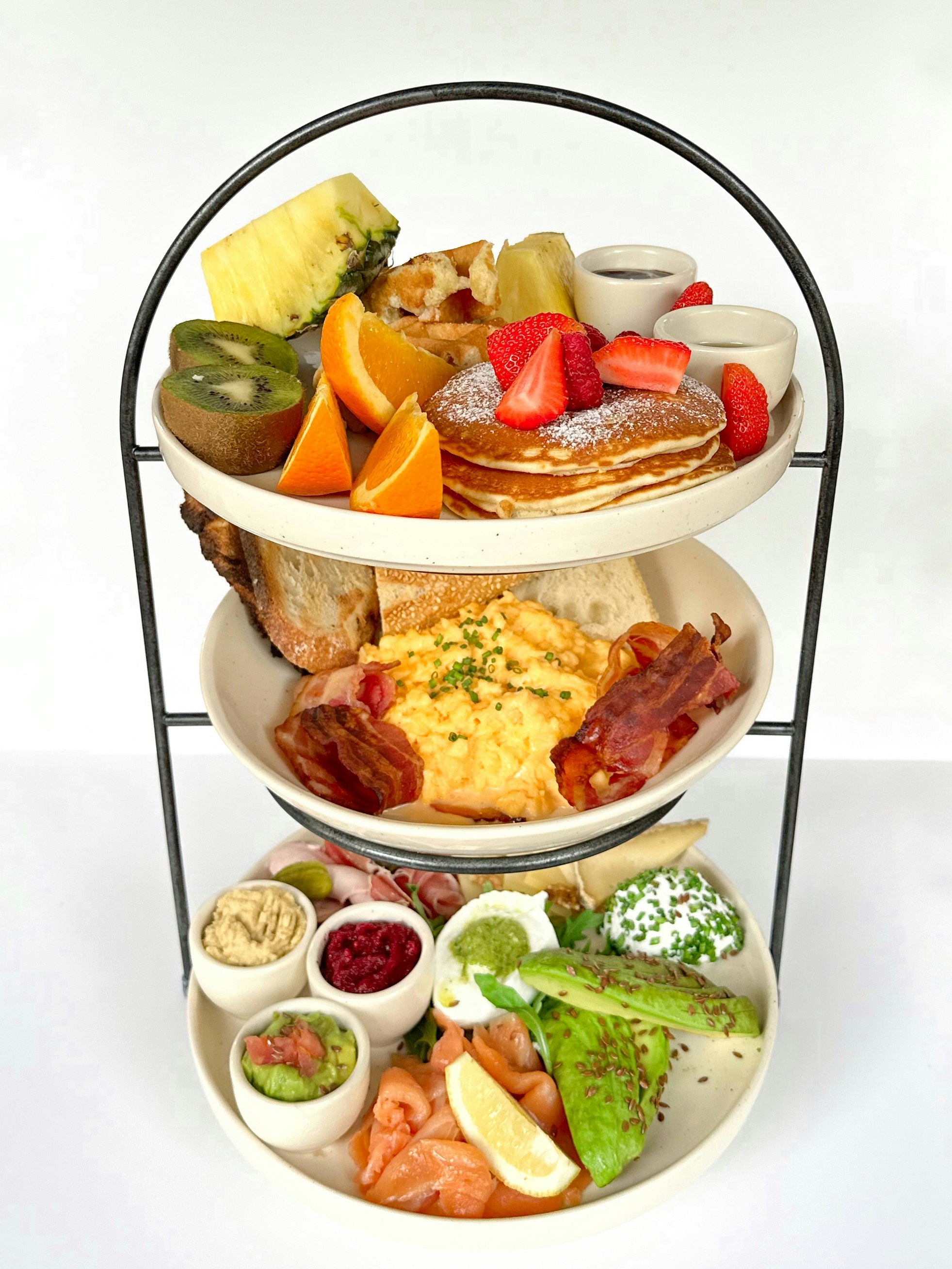 soft-boiled eggs, bacon, smoked salmon, avocado, cured and cooked hams, Gruyère, Tomme cheese, mozzarella di bufala, fresh goat's cheese with chives, guacamole, hummus, pancakes, Belgian waffle, red fruit, pineapple, kiwi, orange, maple syrup, homemade chocolate sauce, basket of bread, croissant, pain au chocolat, choice of hot drinks and two Mimosa cocktails