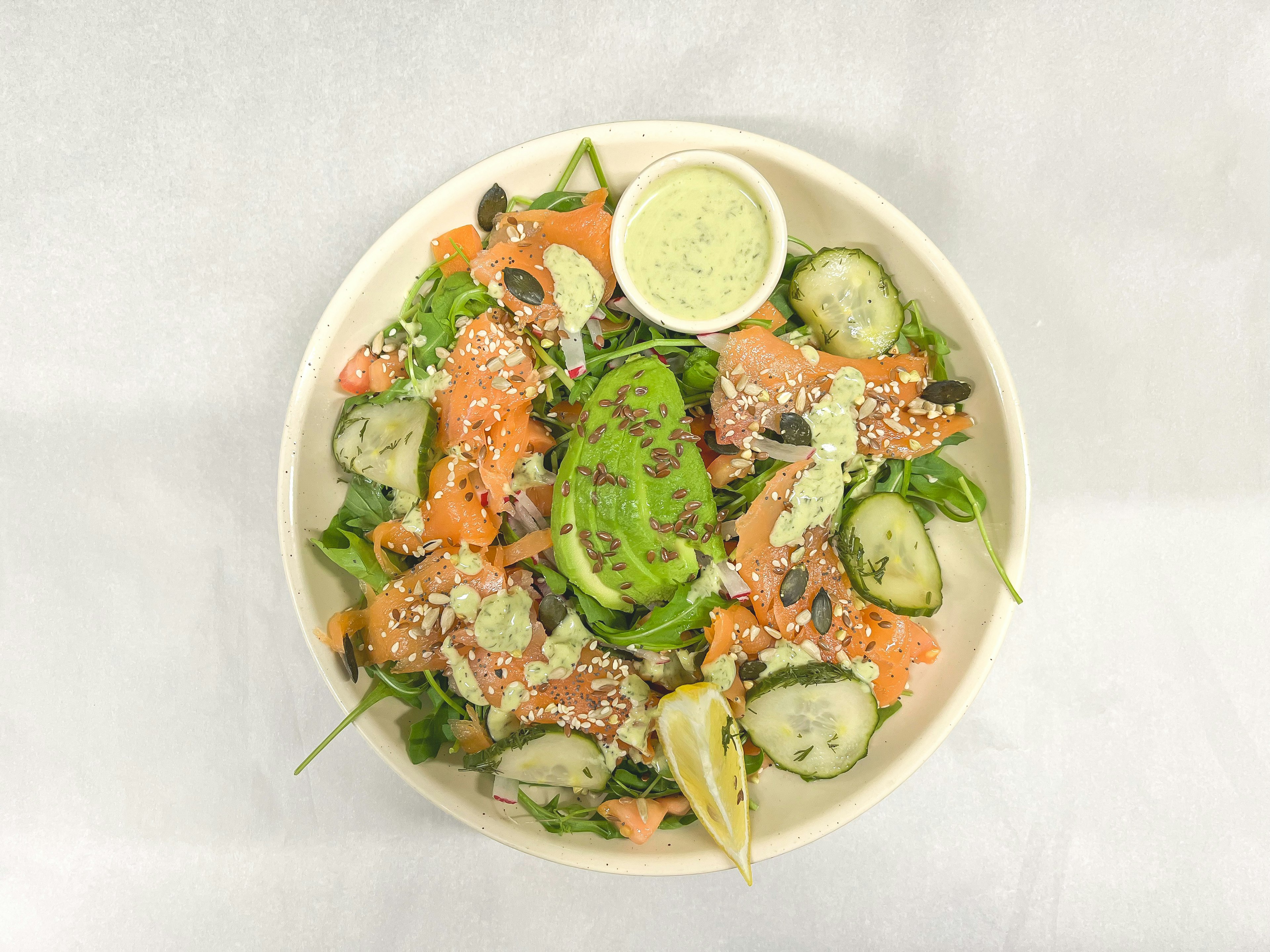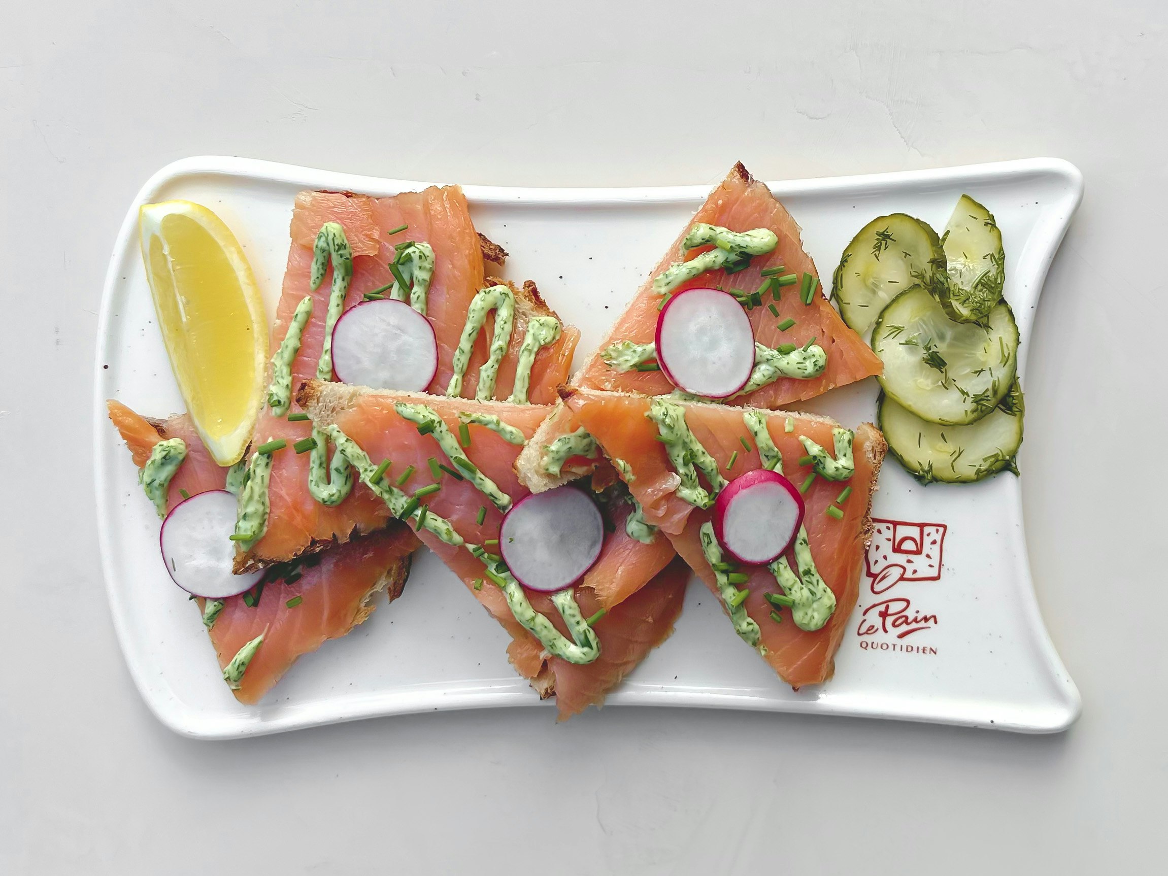 smoked salmon, avocado, cucumber pickles, radish, homemade herb sauce, chives , and lemon