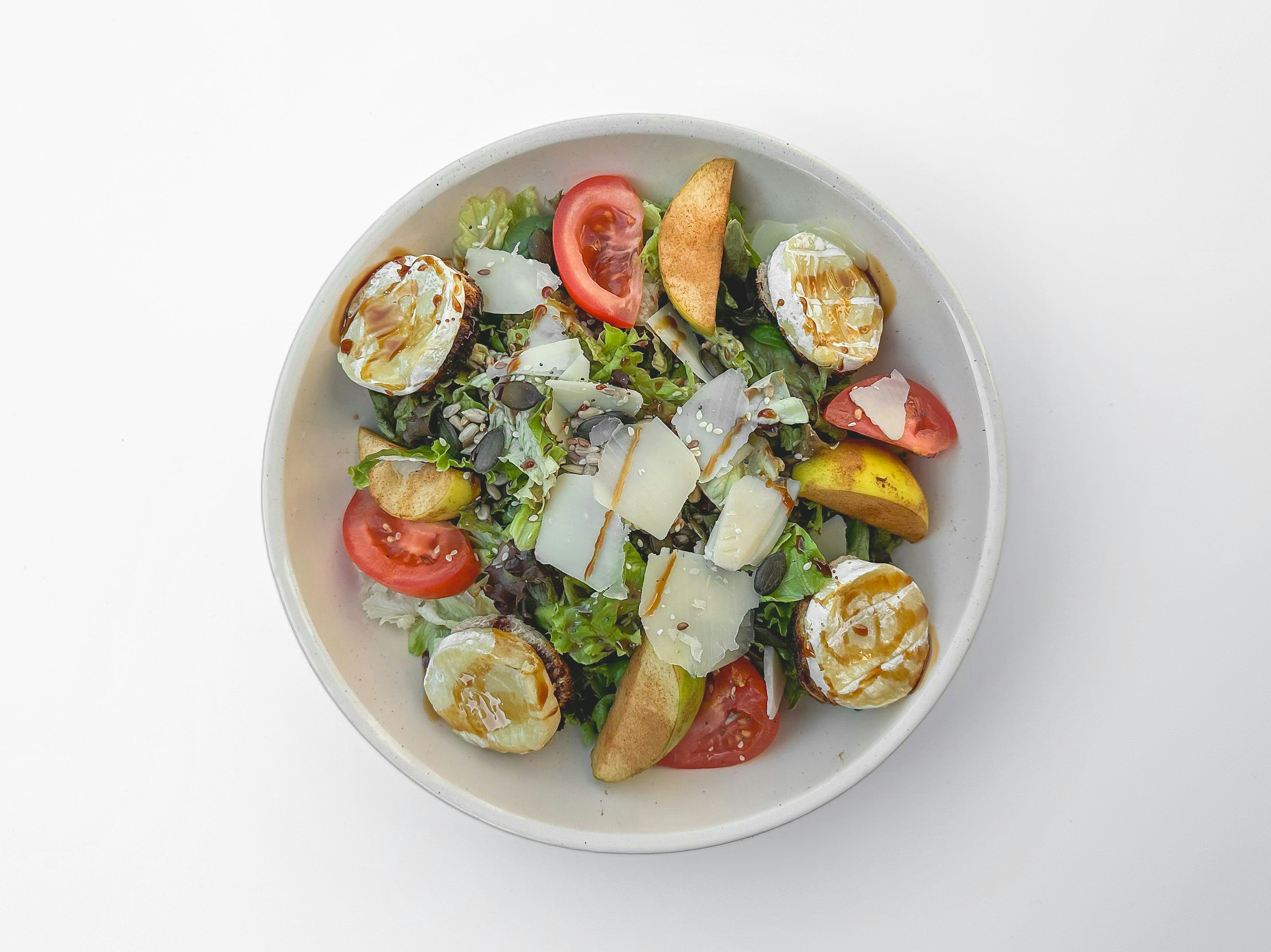 pear syrup, tomato, apple, super seeds, Parmigiano Reggiano AOP, balsamic vinaigrette and toasts