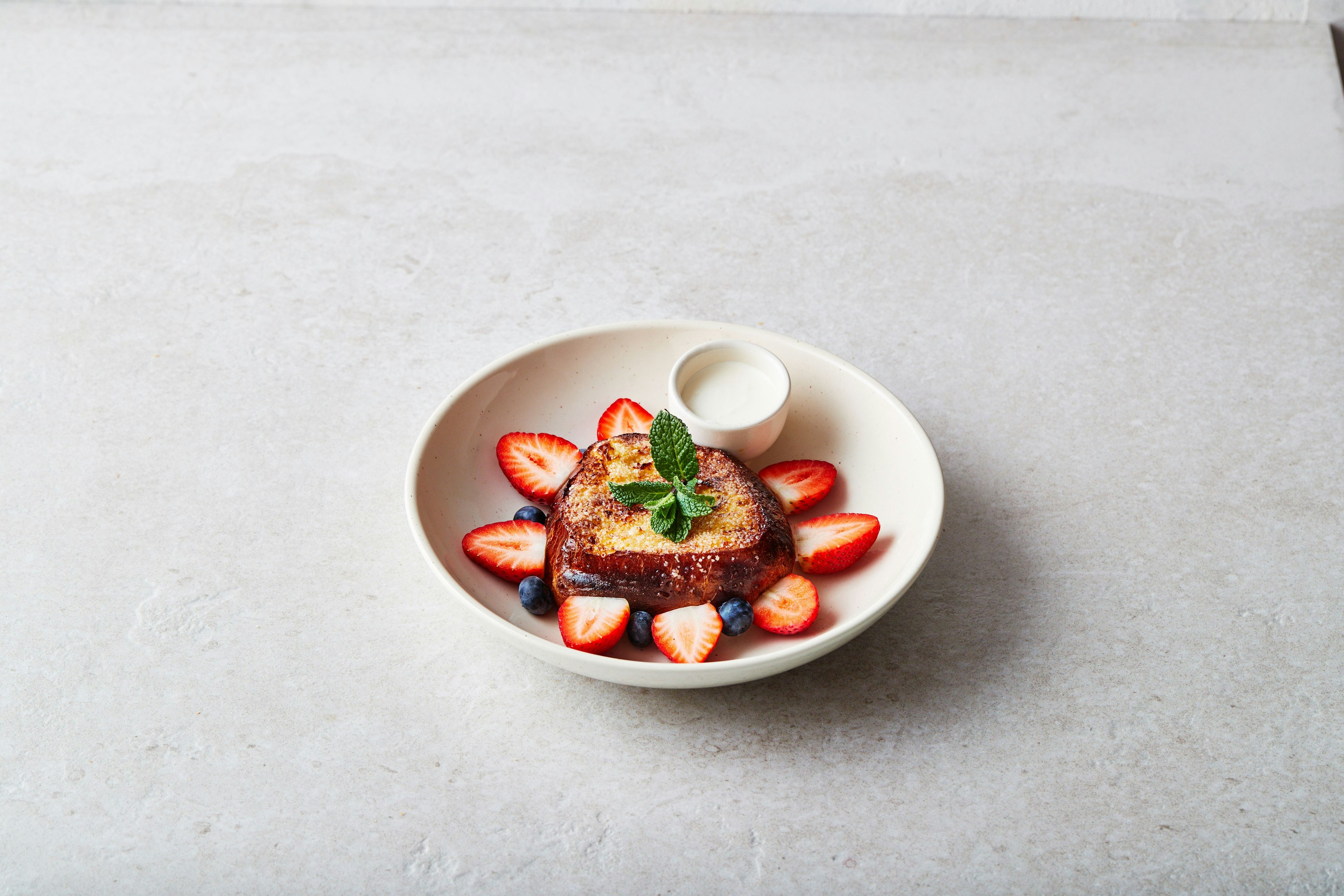 Notre fameuse brioche est préparé à la perfection avec une légère couche de sucre et servie avec des fruits frais, en fonction de la saison.