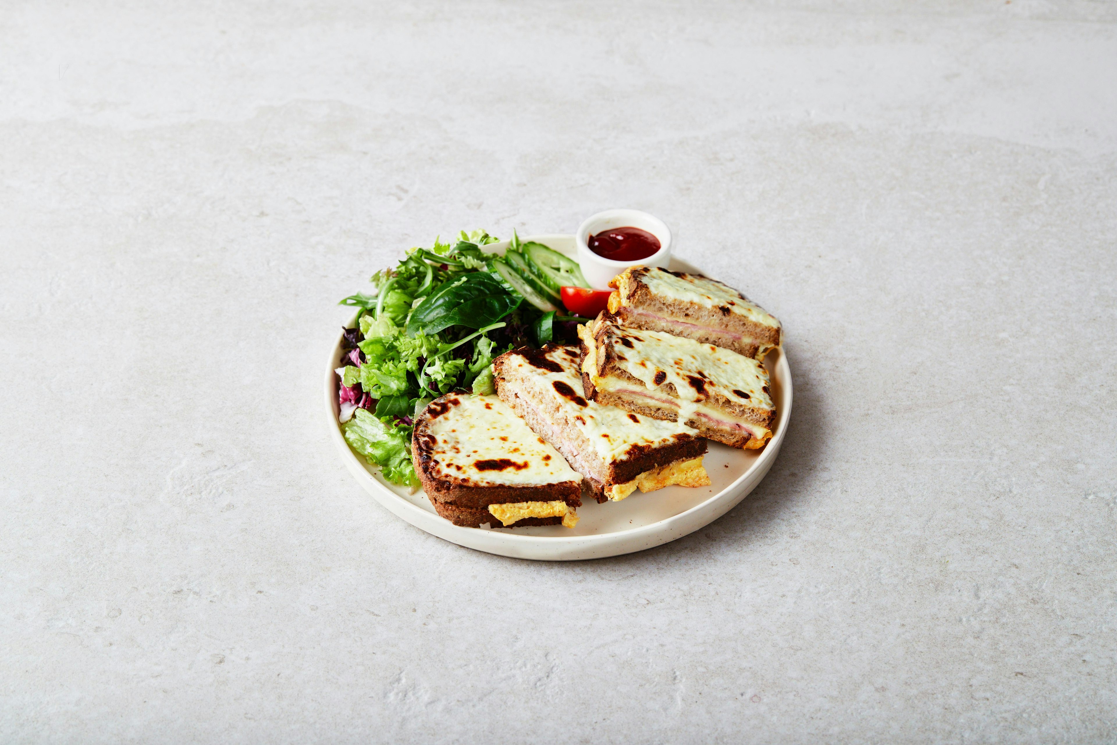 Vous avez faim ? Nous avons le plat qu'il vous faut ! Notre croque monsieur vous comblera encore et encore. Un délicieux pain de blé au levain biologique, généreusement garni de jambon et de Comté fondant.