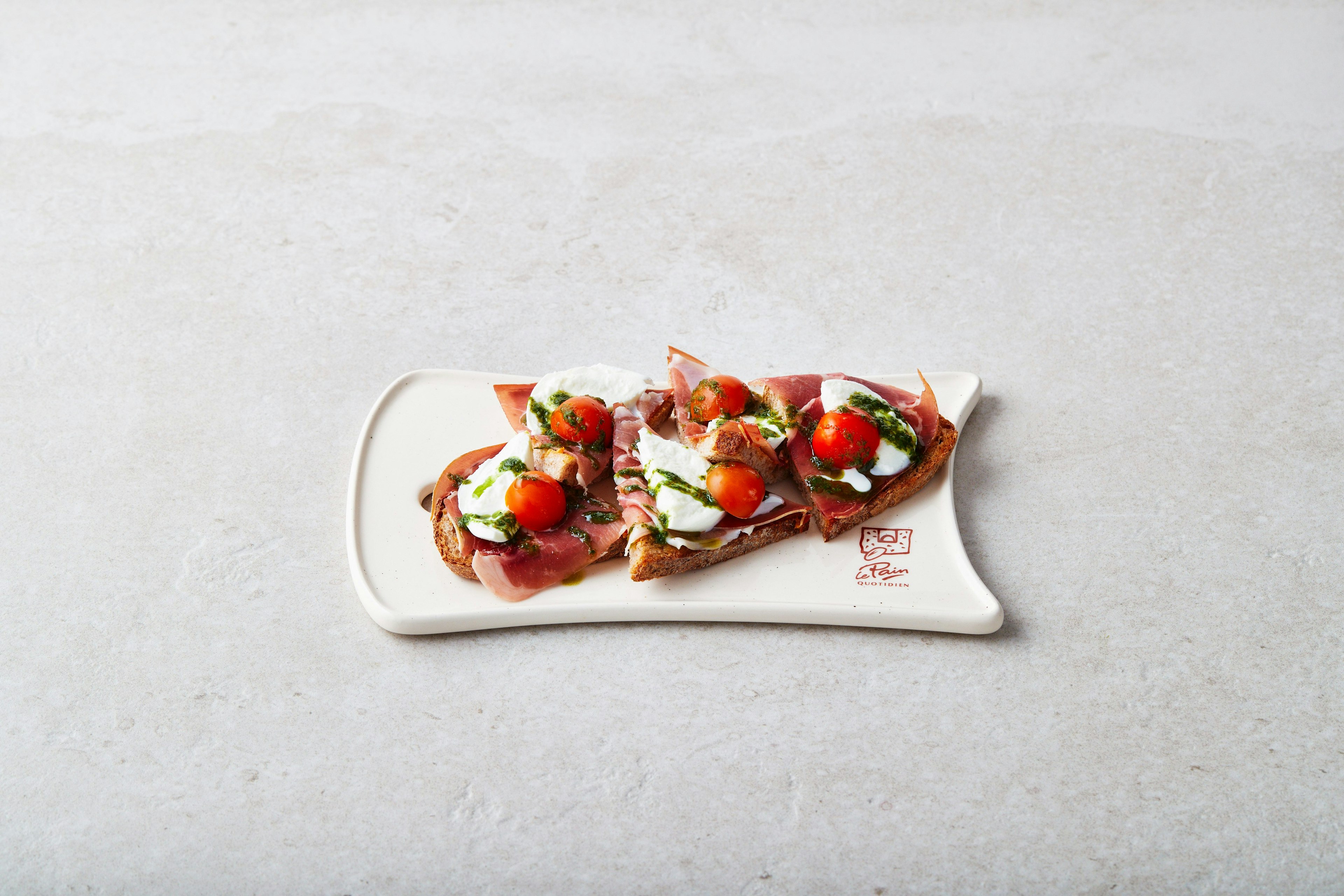 Proef de smaak van Italië met deze open-faced delight: delicate parmaham en romige buffelmozzarella op geroosterd biologisch zuurdesem, afgewerkt met een vleugje pesto rosso en een drupje geurige basilicumolie. Een levendige medley van heirloom tomaten voegt frisheid en kleur toe aan elke hap.