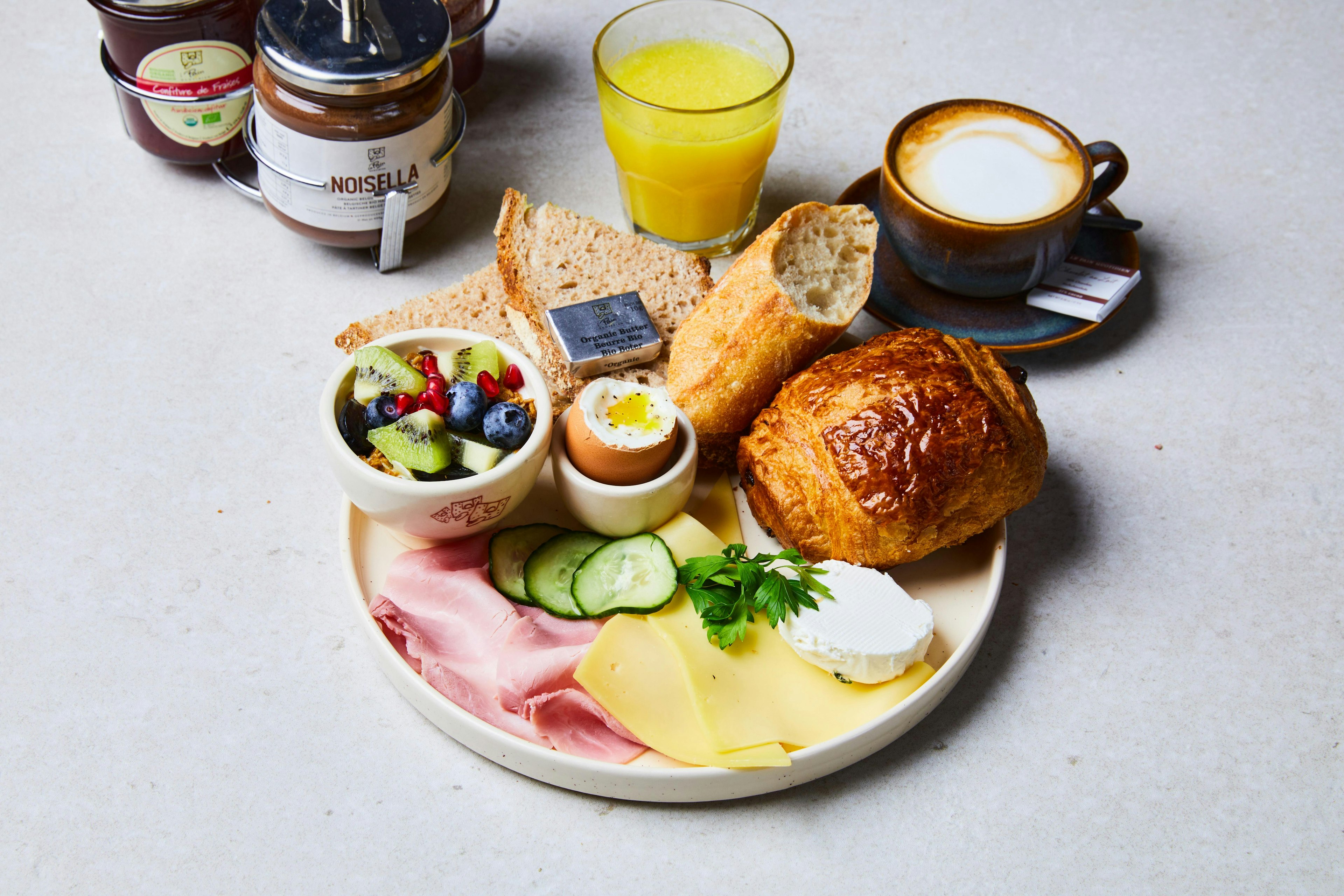 Pain au chocolat of botercroissant, biologisch zuurdesem tarwebrood & biologisch stokbrood, mini granola parfait (biologische gewone yoghurt of plantaardige yoghurt), biologisch zachtgekookt ei, klassieke biologische warme of koude dranken & verse jus d'orange