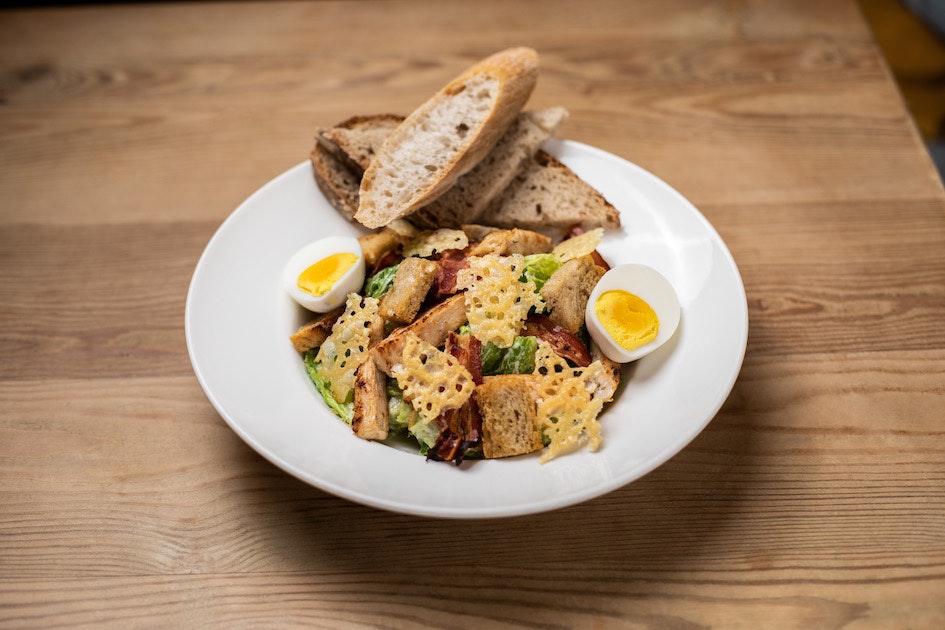 Crisp romaine lettuce tossed in a creamy, tangy dressing, topped with tender grilled chicken, savory accents, and crunchy artisan croutons. Finished with delicate parmesan crisps, this timeless salad is both hearty and refreshing - a classic favorite reimagined.
