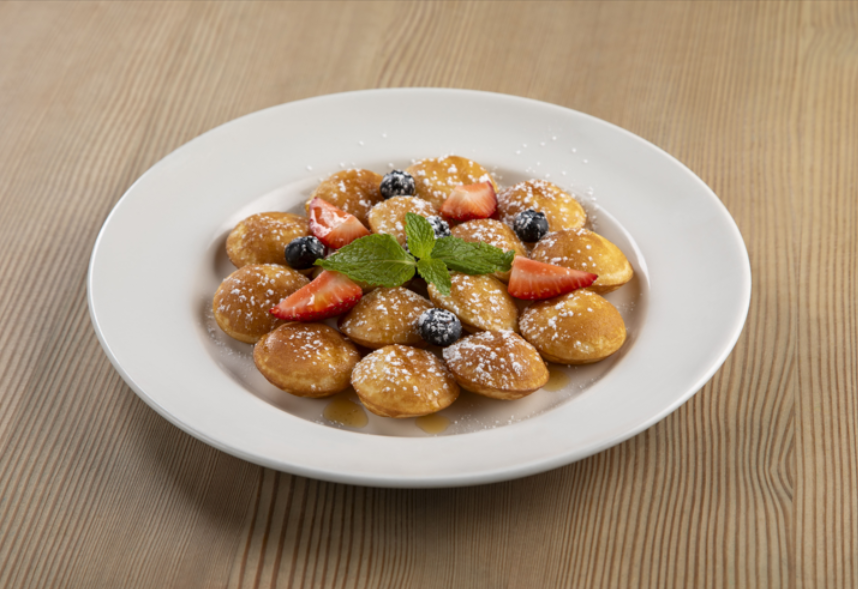 Light, fluffy mini pancakes served warm and topped with a medley of fresh berries. Finished with a drizzle of pure maple syrup for a sweet and colorful treat, perfect for any time of day.