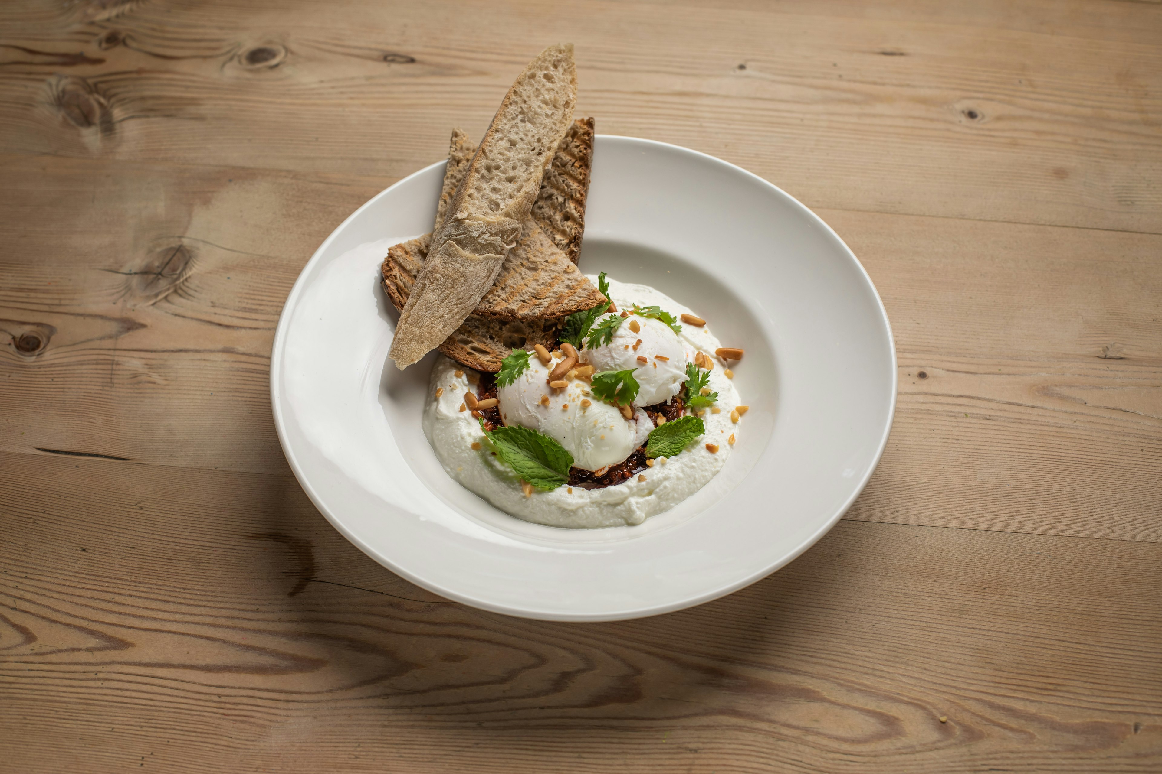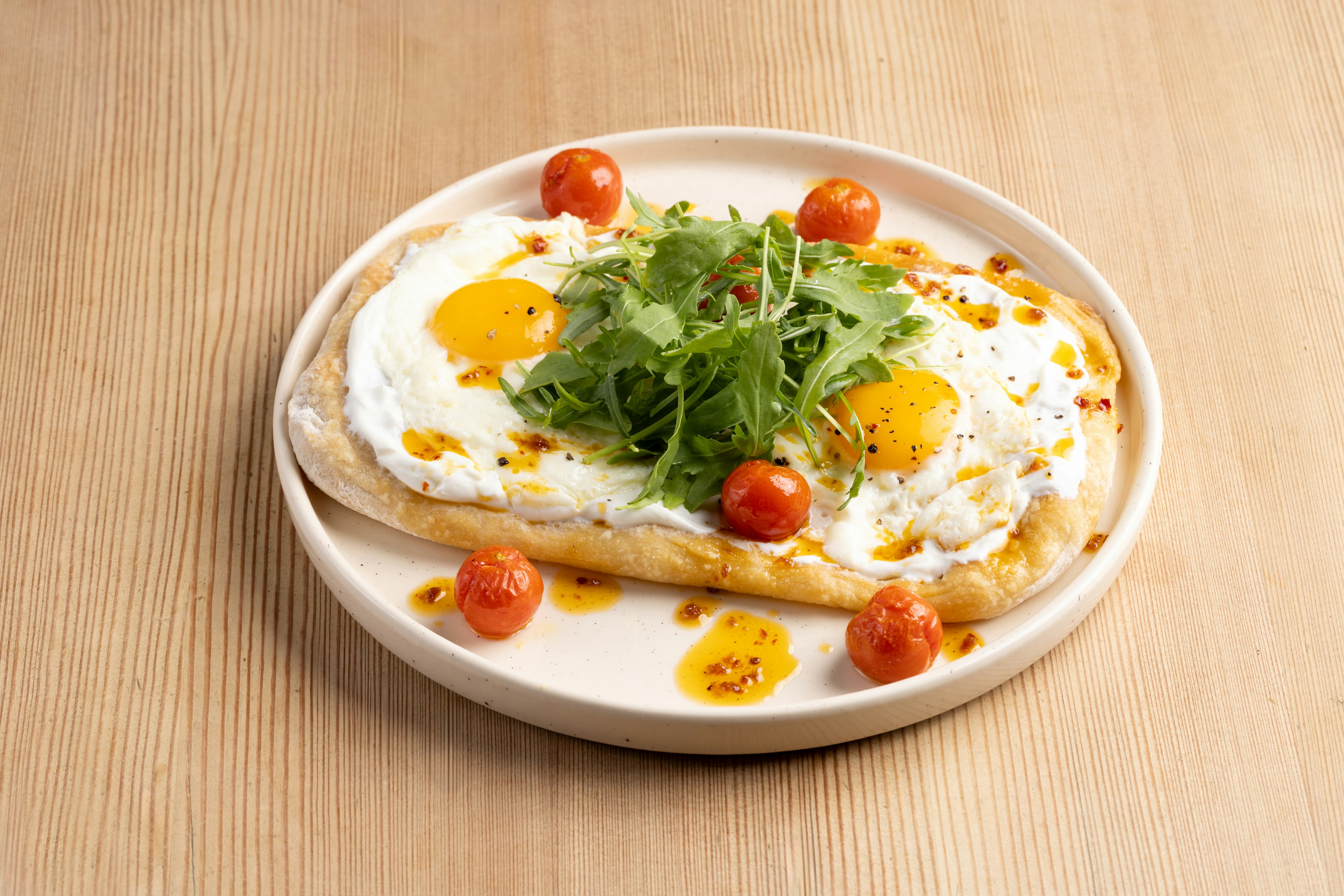 Two perfectly poached eggs nestled on a bed of creamy, tangy yogurt, finished with a warm, spiced tomato sauce and served alongside toasted artisan breads. A vibrant and comforting dish that brings together rich flavors and satisfying textures for a memorable breakfast or brunch experienc