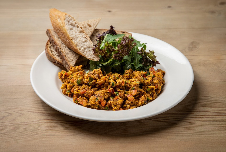 Fluffy, perfectly scrambled organic eggs infused with a kick of spice and aromatic flavors. Served alongside toasted artisan sourdough, this dish brings warmth and zest to your breakfast table.