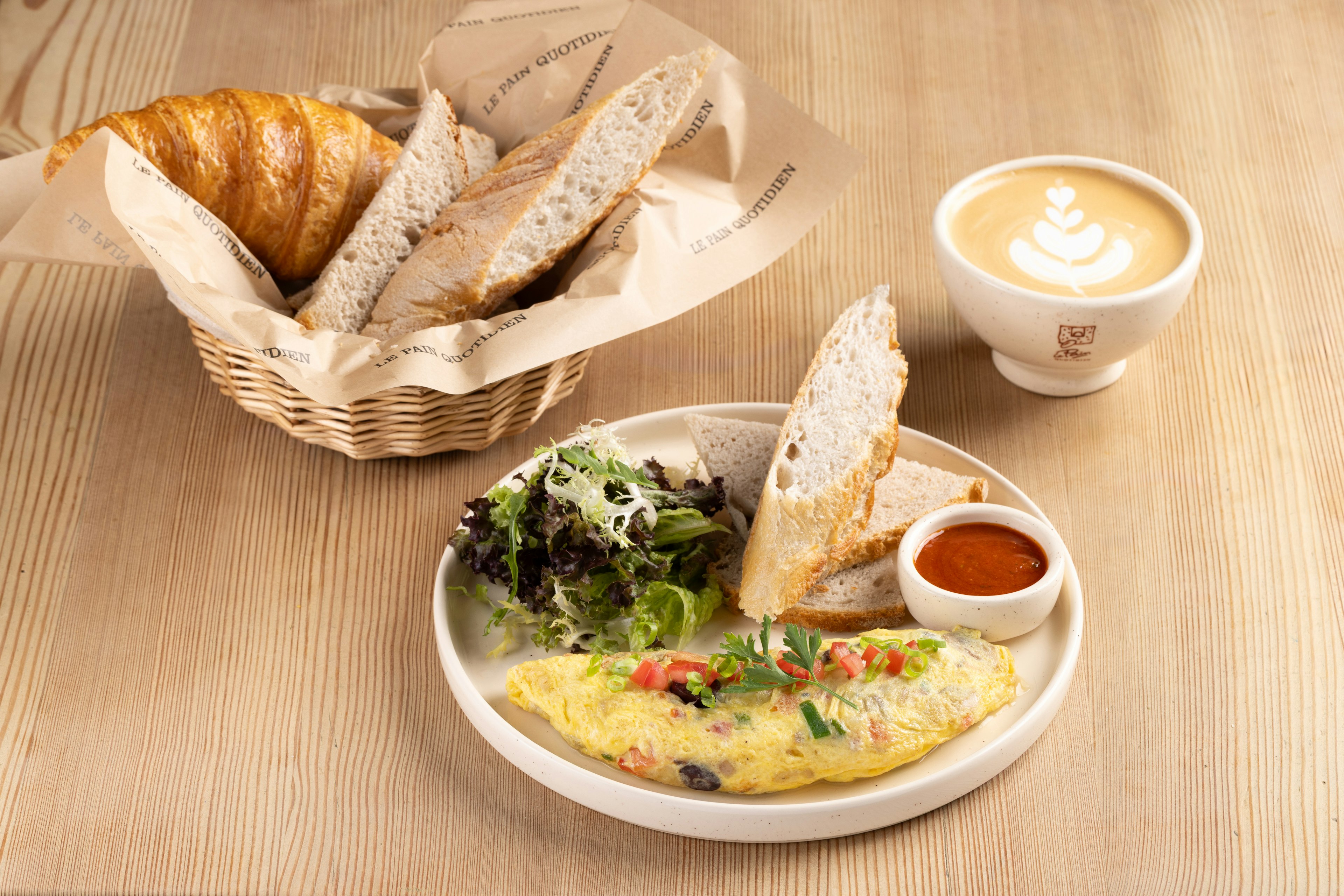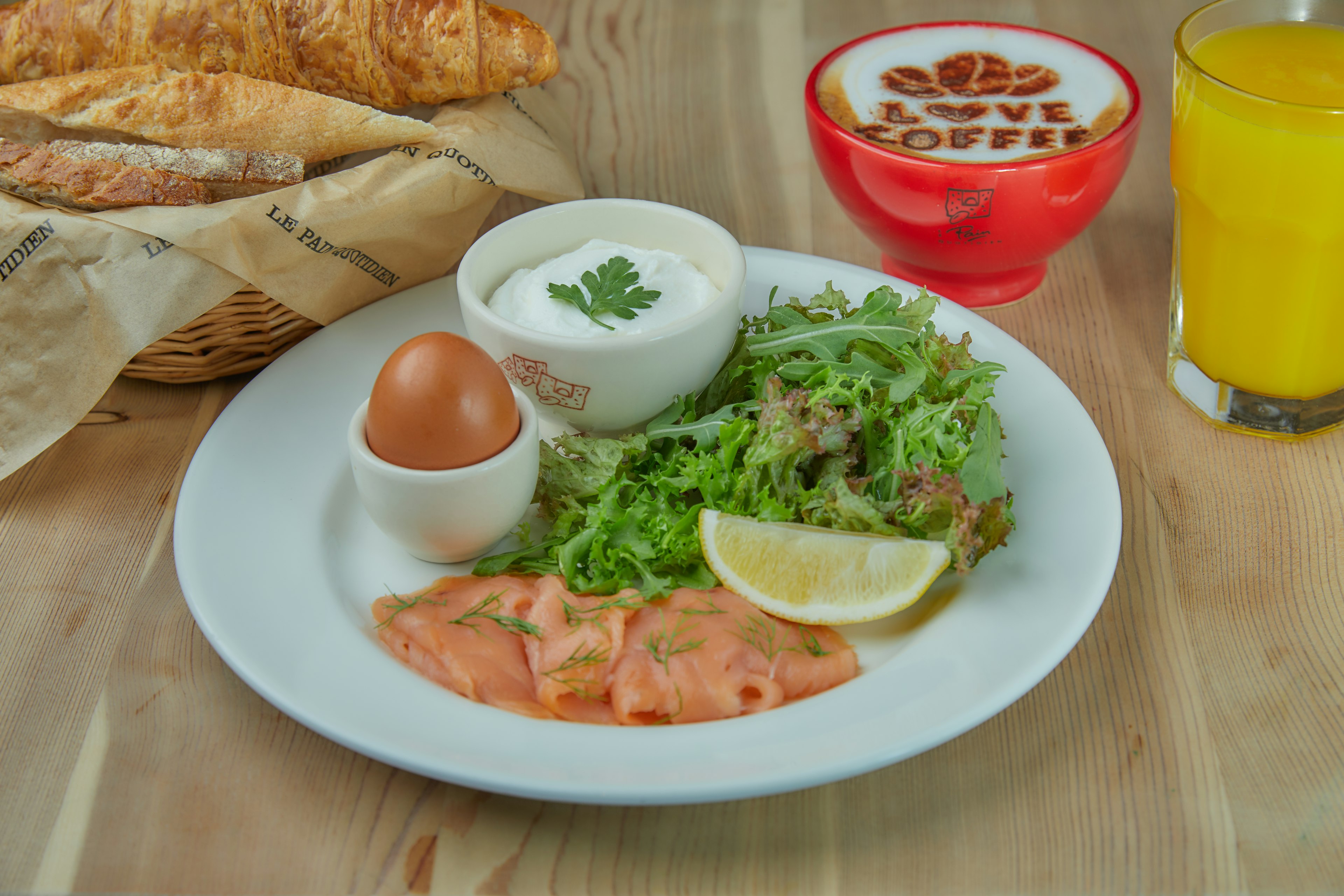 A refined brunch plate featuring a soft-boiled egg, silky smoked salmon, and creamy labneh, accompanied by a petite granola parfait. Served with a selection of freshly baked artisan breads, your choice of hot beverage, a glass of fresh orange juice, and a classic pastry for a complete and satisfying start to your day.
