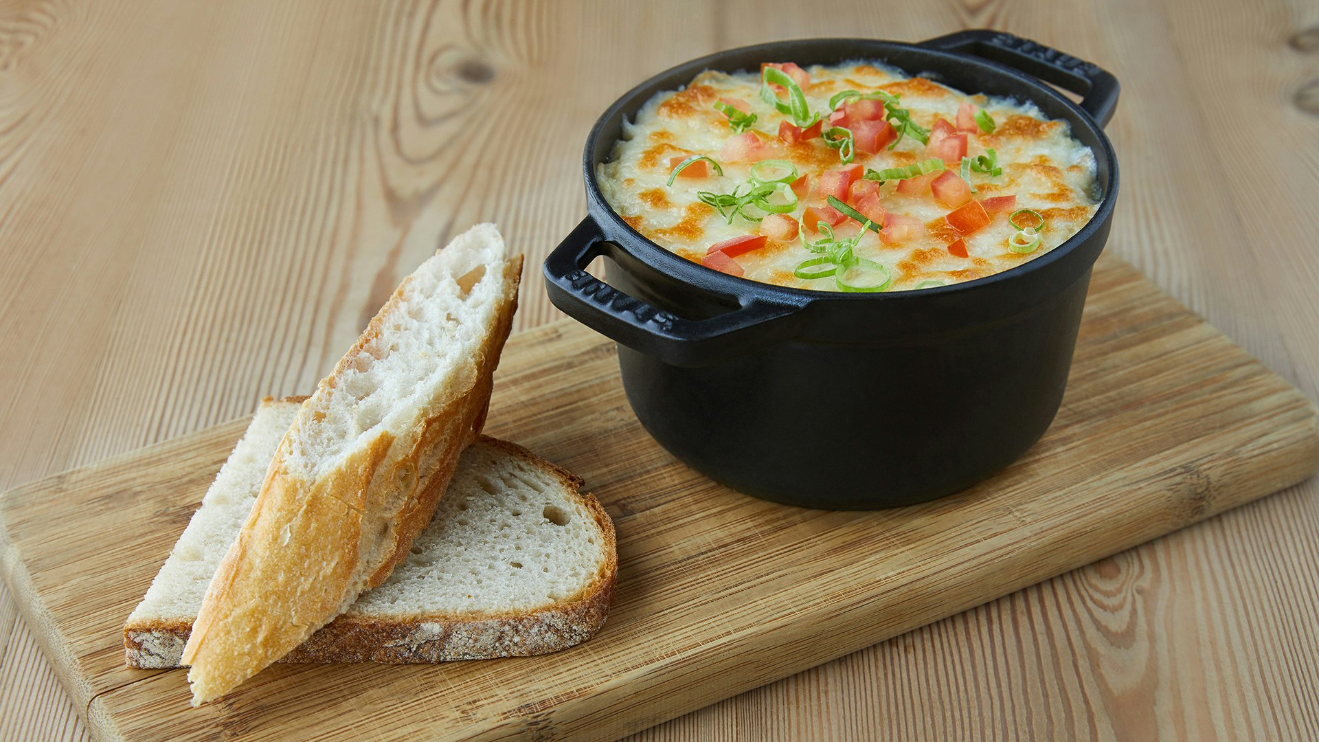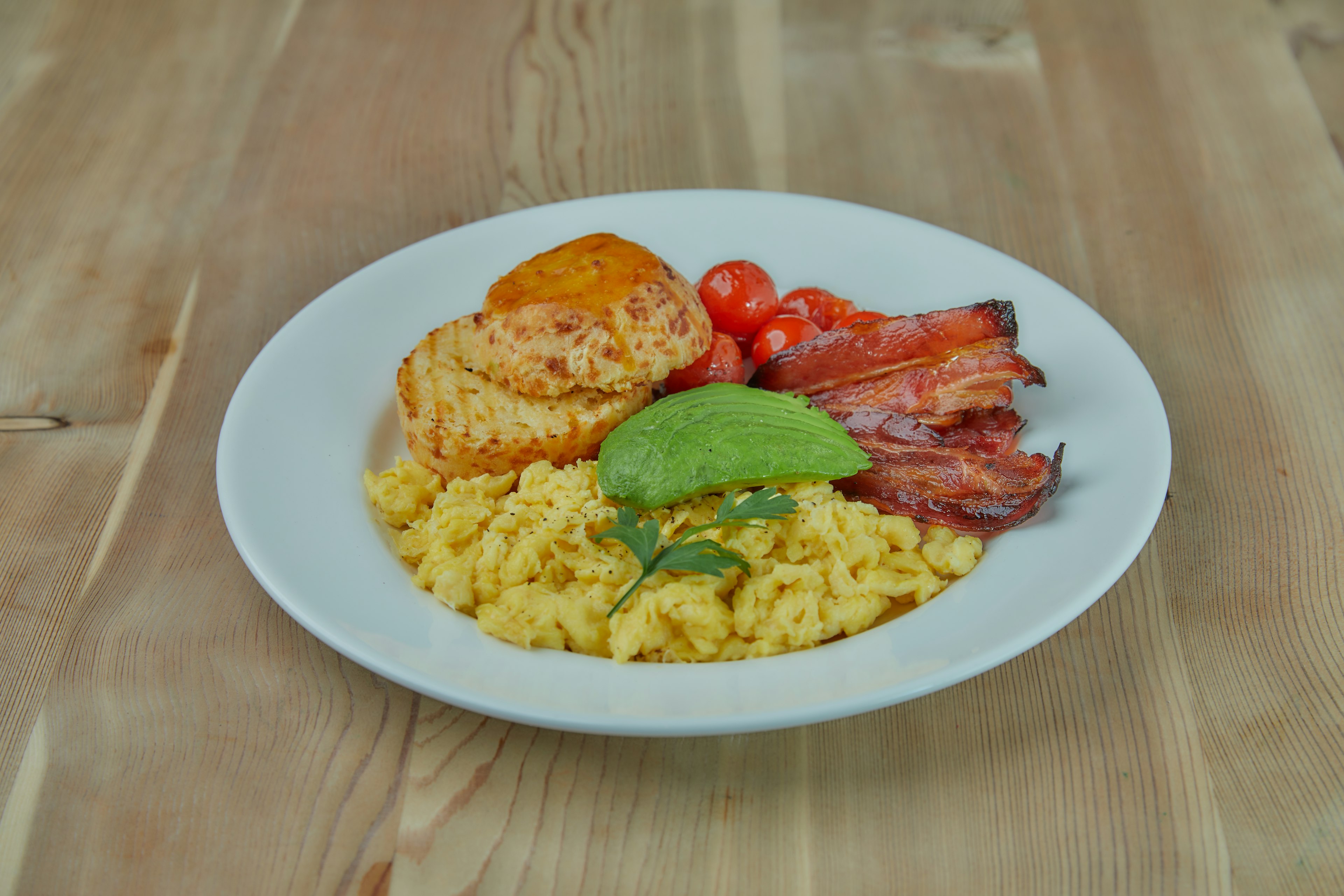 A hearty, classic breakfast to start your day right. Enjoy perfectly baked scrambled eggs, savory cherry tomatoes, alongside grilled veal bacon and avocado. Served with a cheese scone for the perfect finishing touch.
