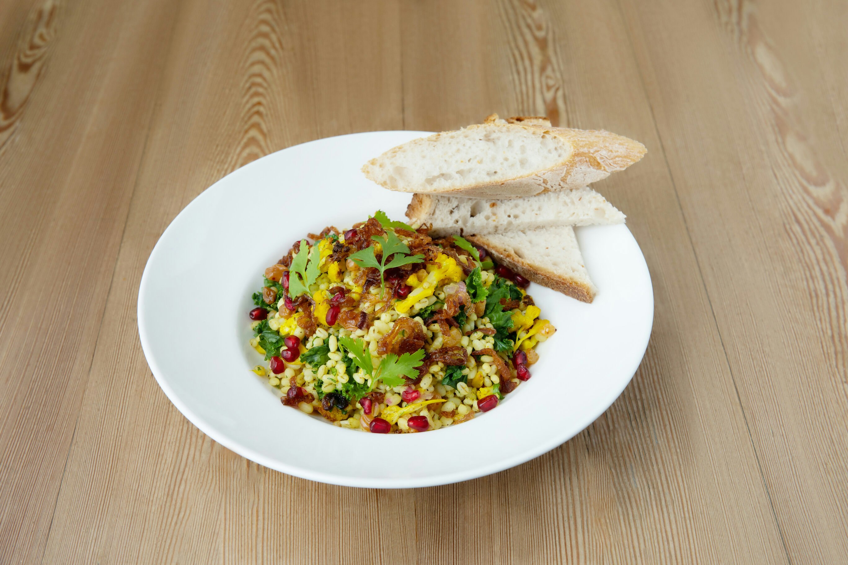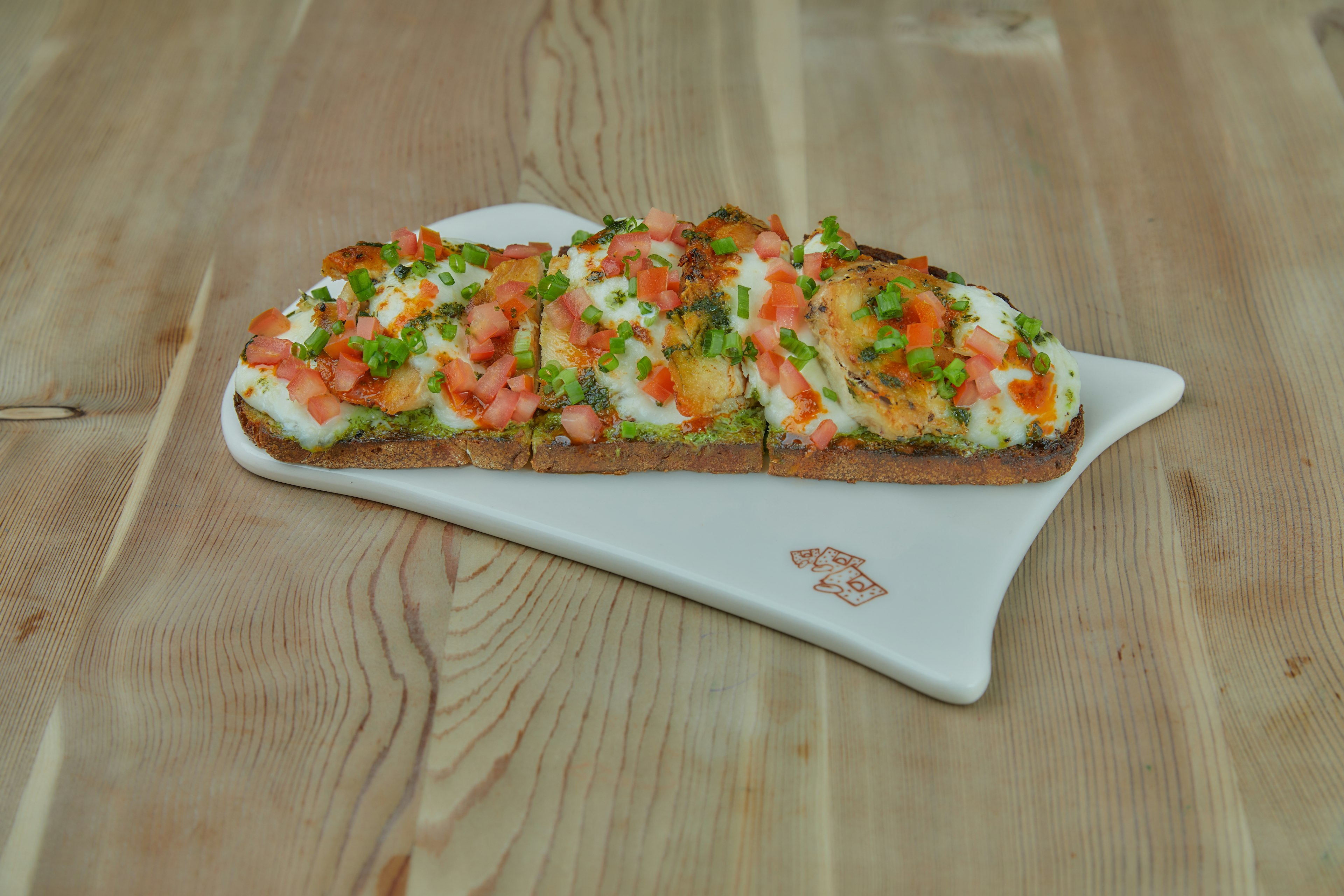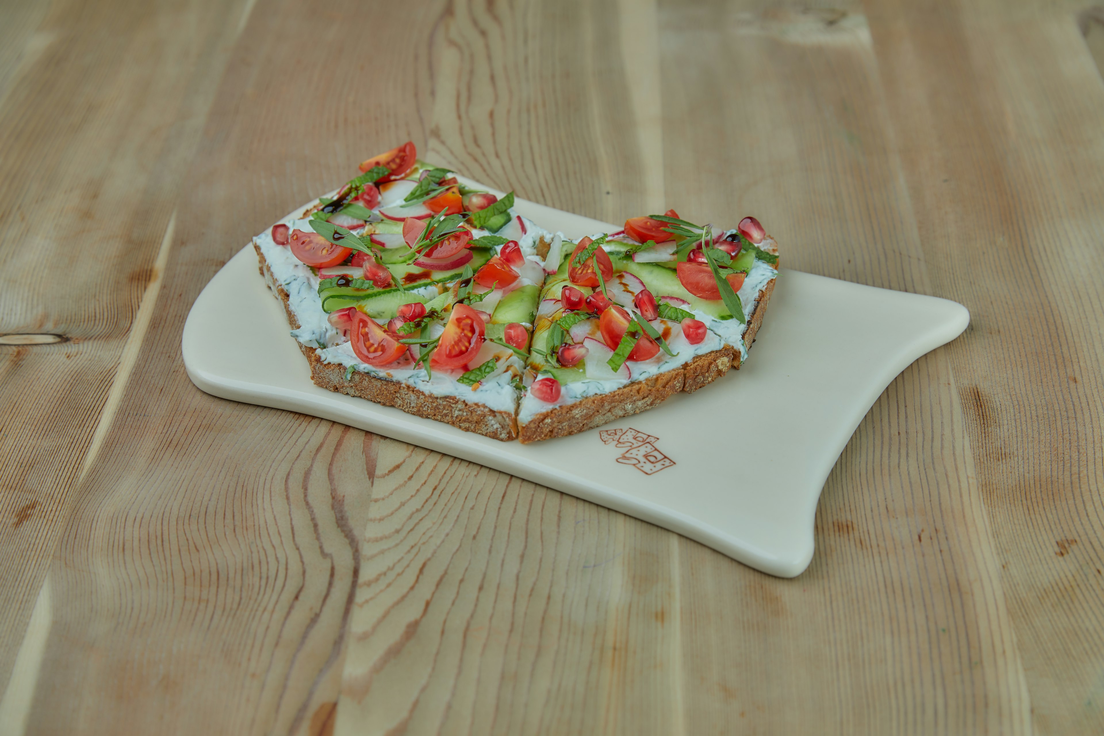 A toasted slice of our signature organic sourdough generously spread with creamy labneh and finished with a vibrant medley of crisp vegetables and fresh herbs. Accented by aromatic za’atar and a drizzle of tangy pomegranate molasses, this tartine offers a refreshing balance of flavors.