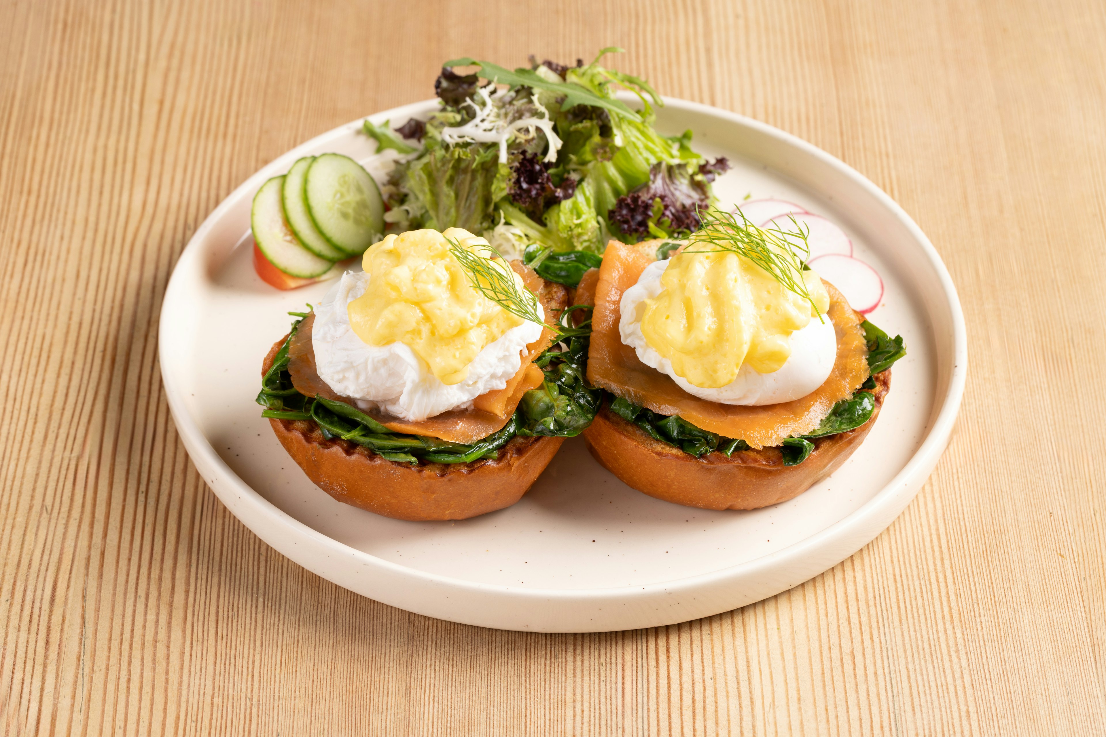 Two perfectly poached eggs layered on soft brioche, complemented by silky smoked salmon and fresh baby spinach. Finished with a generous drizzle of rich, homemade hollandaise sauce for a luxurious twist on a brunch classic.