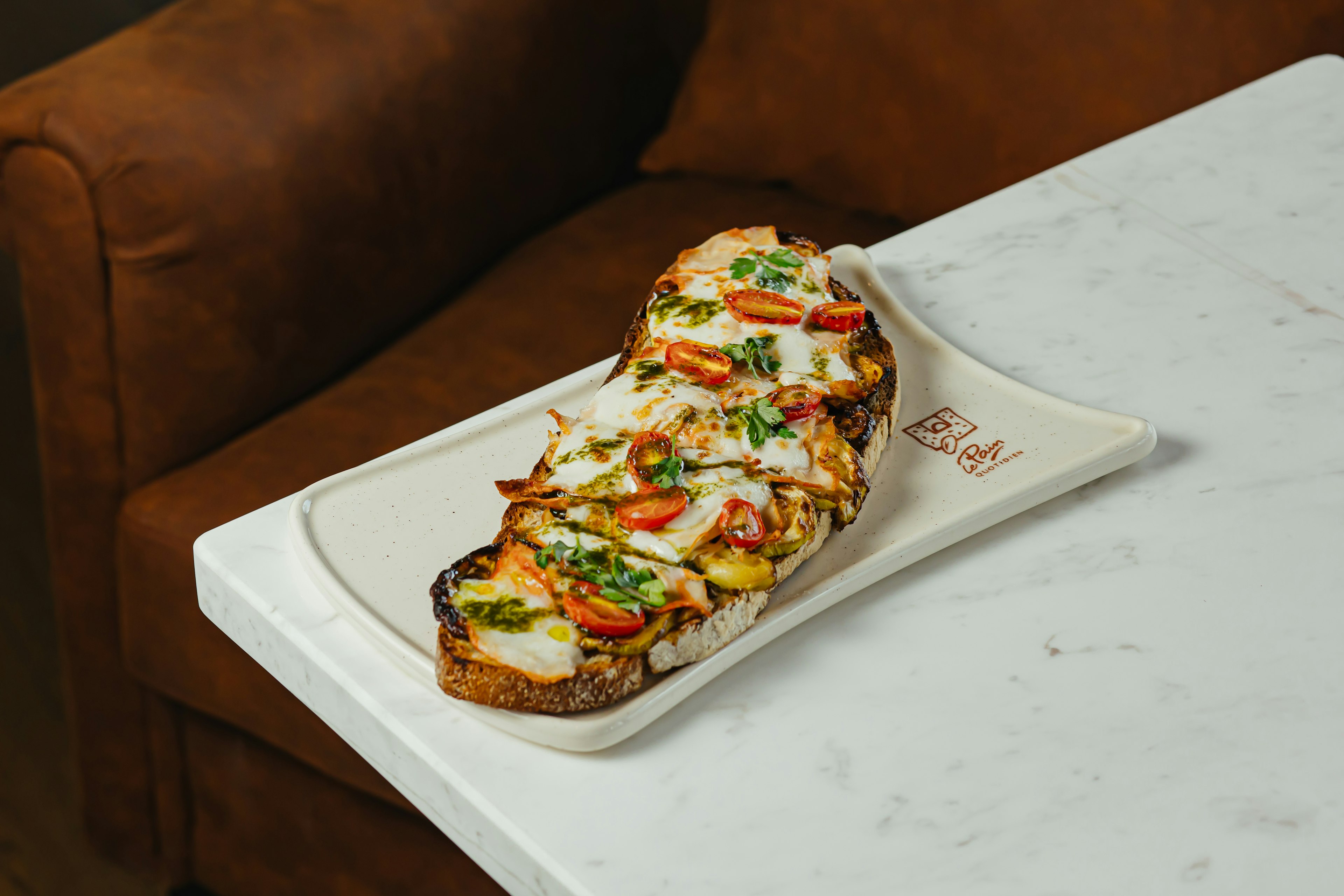 Classictoasted sourdough wheat bread with smoked chicken, mozzarella, grilled zucchini, basil oil and parsley