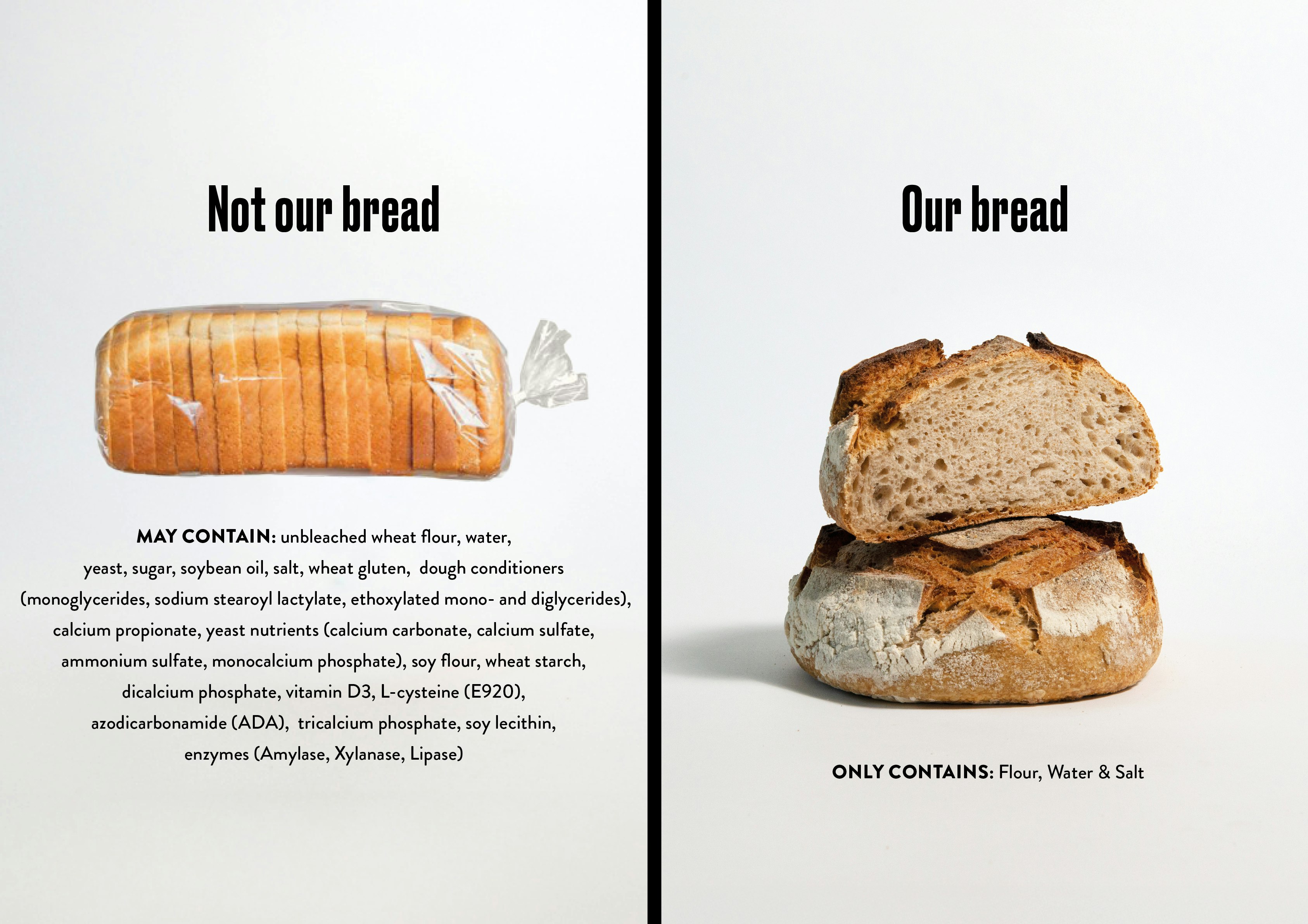 We believe that fewer ingredients mean more honesty and authenticity on the plate. By leaving out artificial E-numbers and keeping recipes as pure as possible, our bread reflects a clean eating philosophy— clear labeling and genuine transparency. Not our bread, by contrast, can often be a mystery, with complex ingredient lists and vague descriptions that distance the food from its origins.