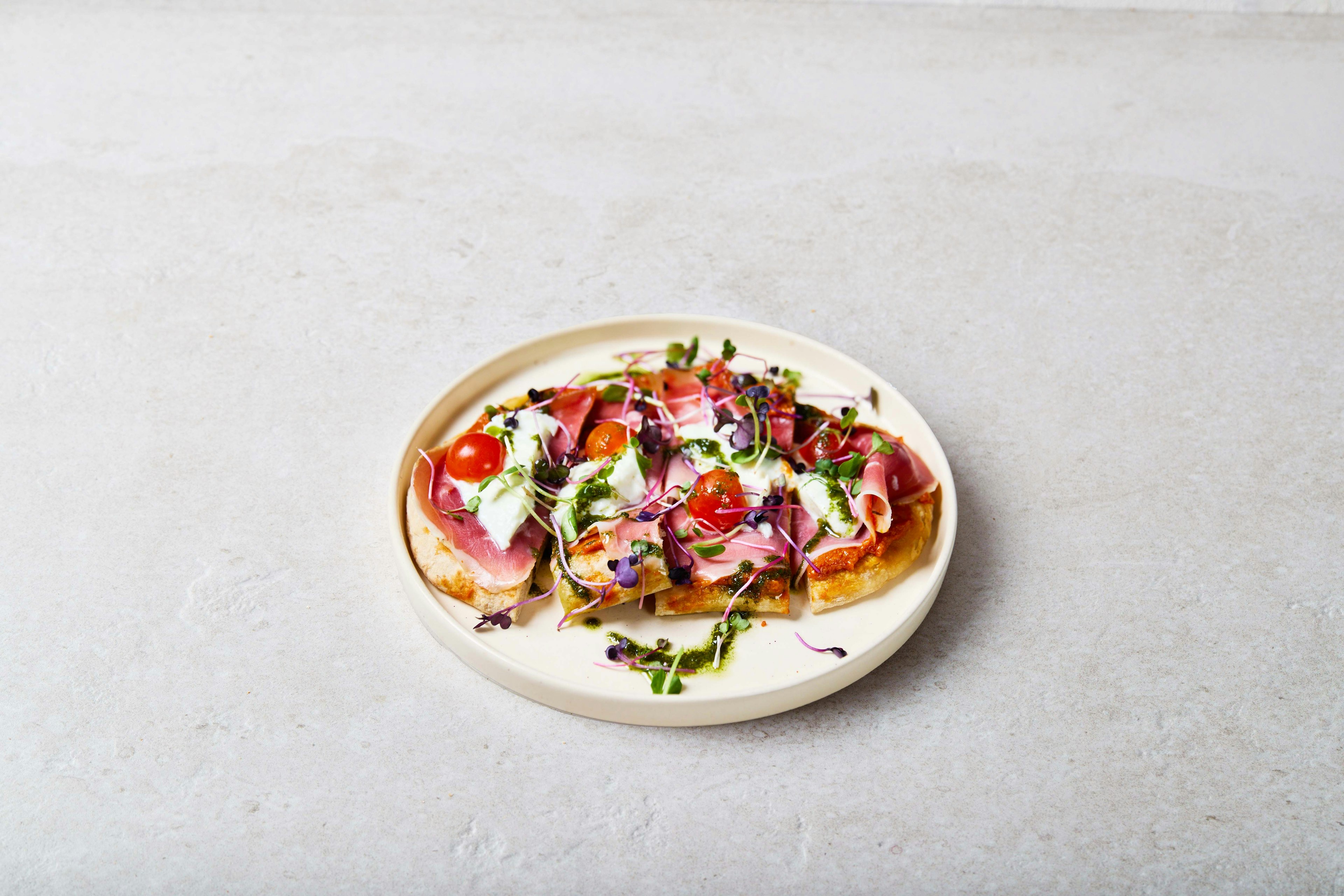gedroogde ham, mozzarella di bufala D.O.P., bio pesto rosso, kerstomaatjesen basilicumolie