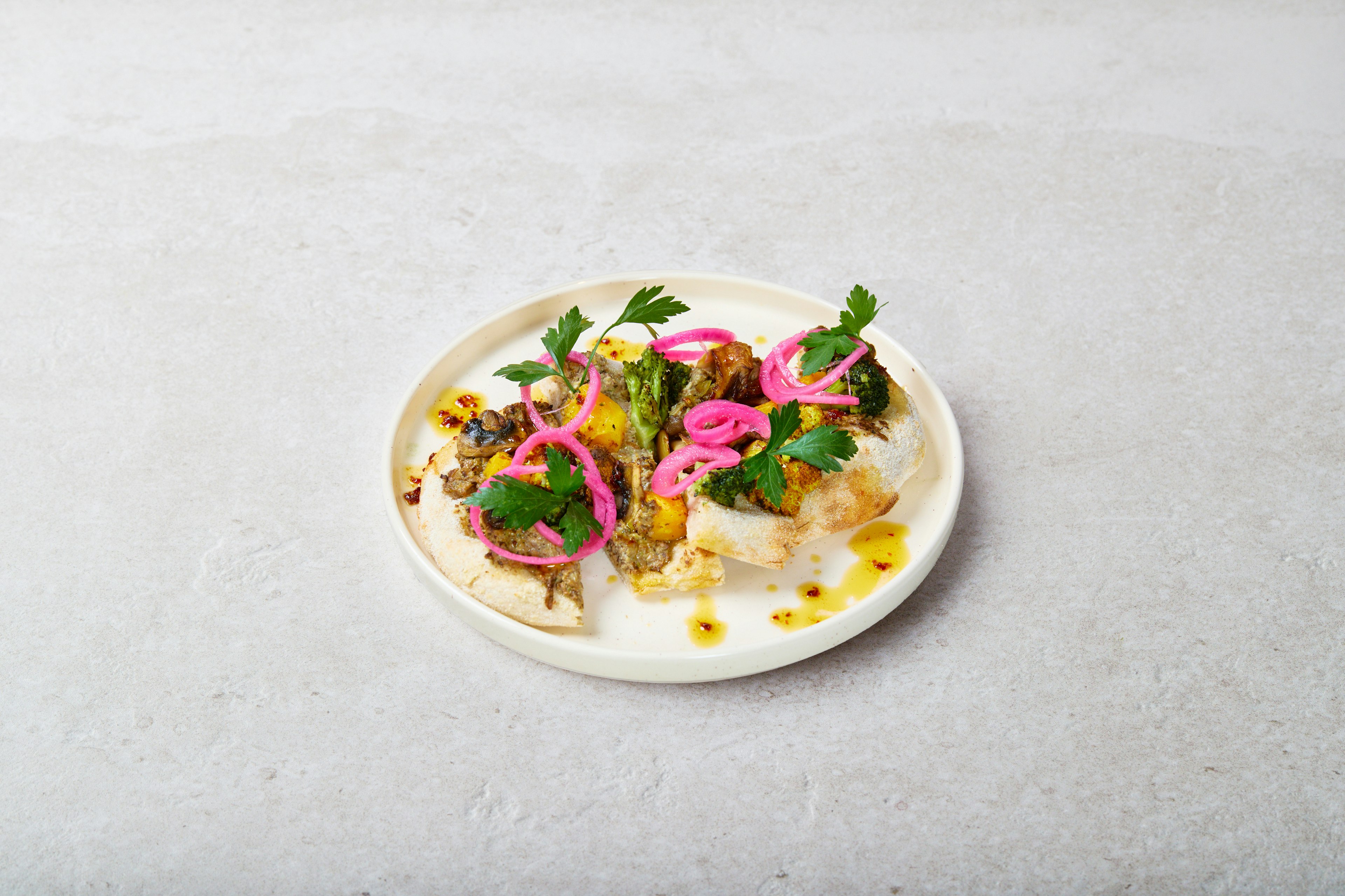 NieuwGeniet van onze Portobello, belegd met champignontapenade, geroosterde butternut, broccoli en portobello’s. Ingelegde rode ui, verse peterselie en een vleugje huisgemaakte licht pittige olie maken dit smaakvolle gerecht compleet.
