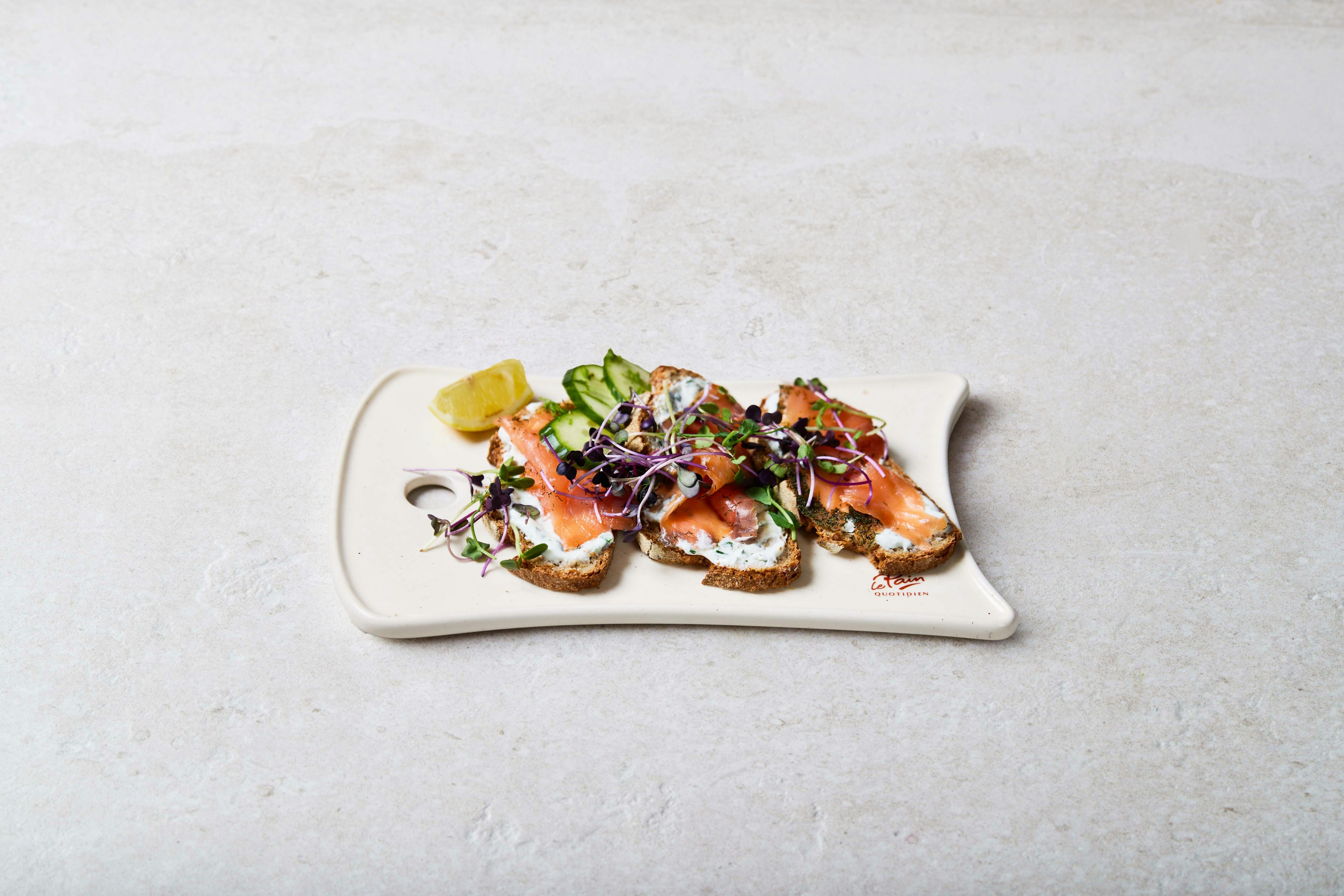 gemarineerde zalm in gravlax stijl, met bio skyr met verse kruiden, mix vank iemgroenten, citroen en komkommer, geserveerd op bio proteïnebrood