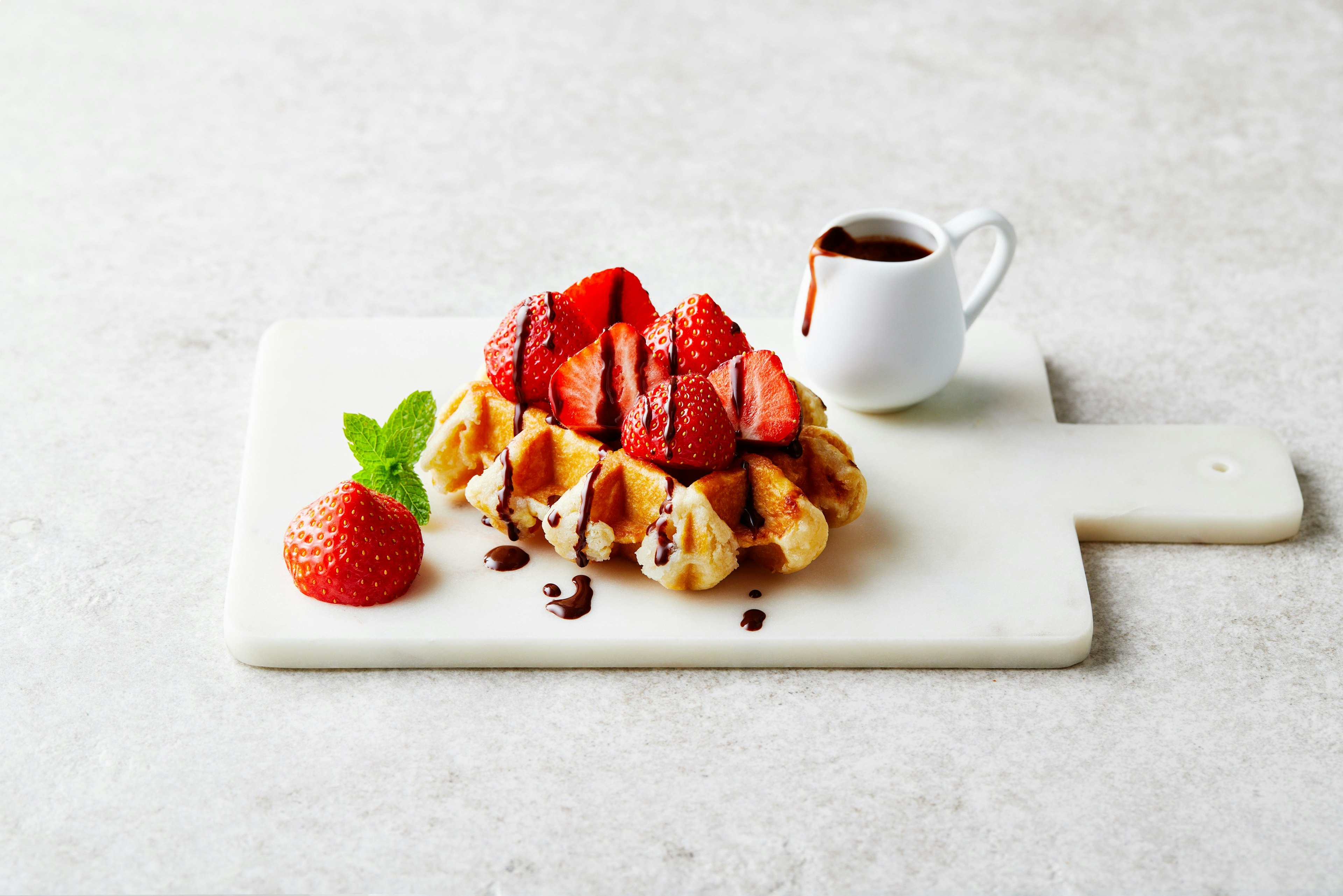 Indulge in our golden Belgian waffle, served warm and crisp. Topped with luscious strawberry slices and drizzled with rich, velvety chocolate sauce, this classic treat is the perfect balance of sweet and decadent.