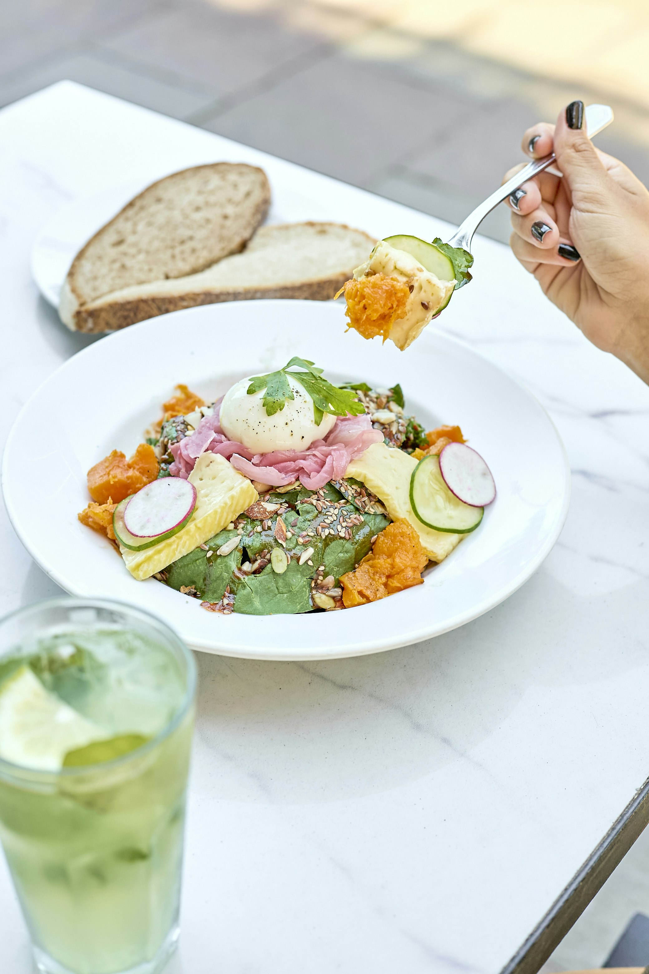 With roasted pumpkin, poached organic egg, toasted almonds, caramelized onion, green leaves, rosehip chutney and mustard vinaigrette.