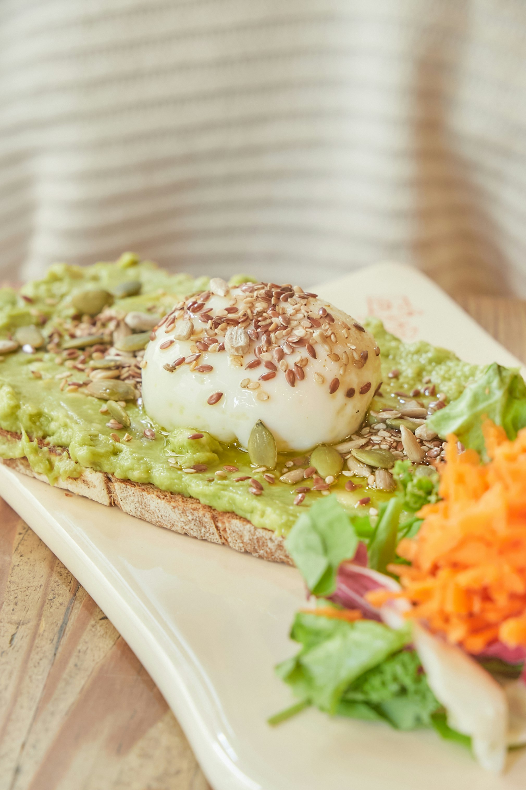 With mashed avocado, poached pastoral egg, seed mix and cumin salt.