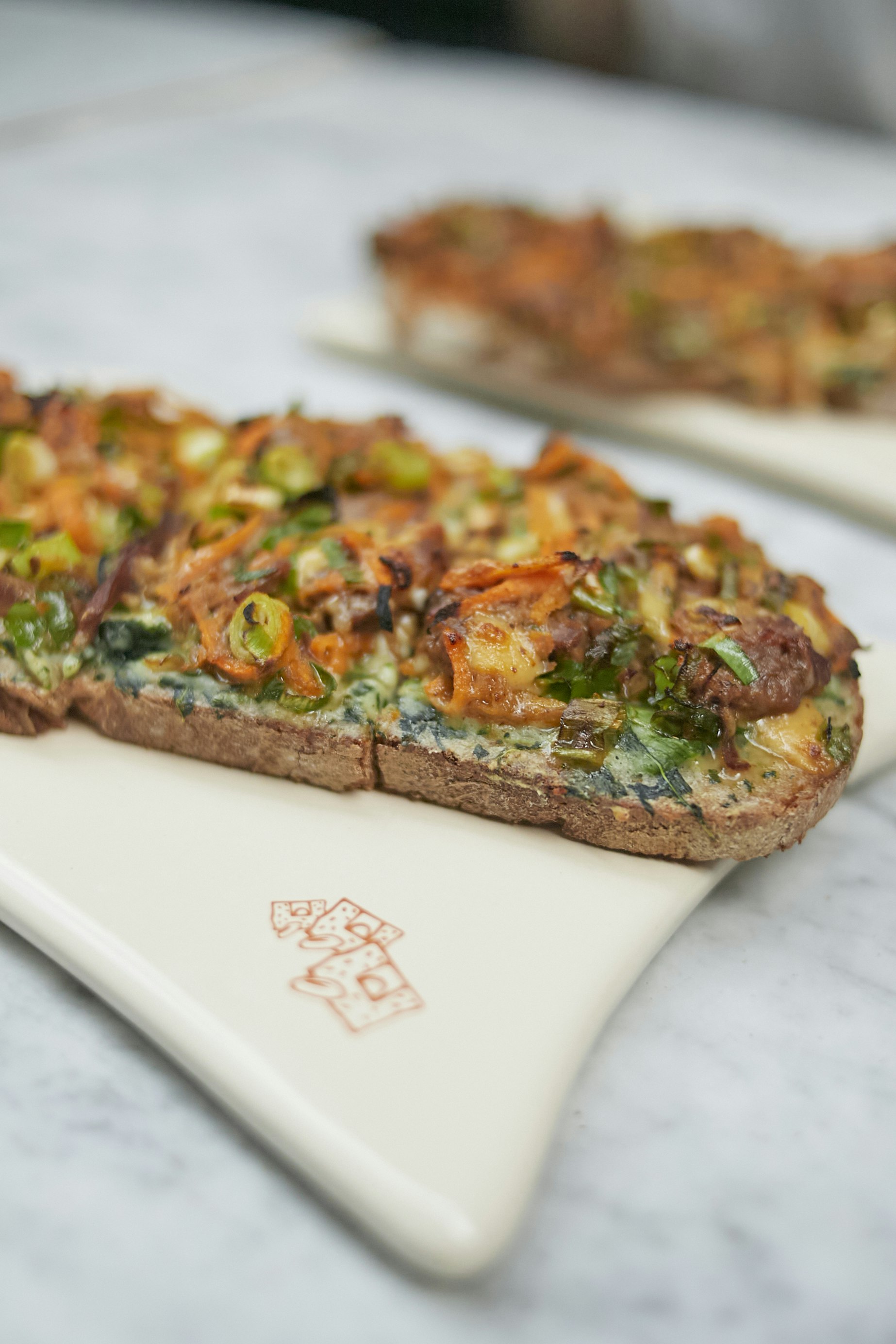 With spinach bechamel, smoked cheese, green onion and organic carrots.