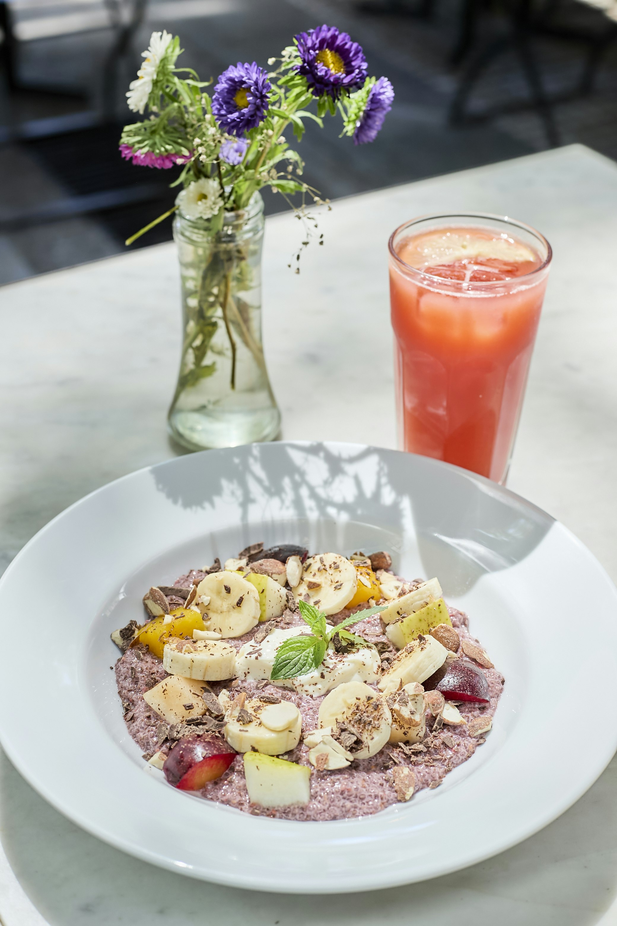 Chia seeds activated, labneh, seasonal fruits, almonds and belgian chocolate .